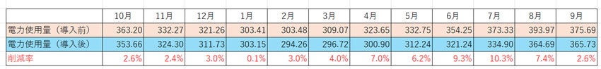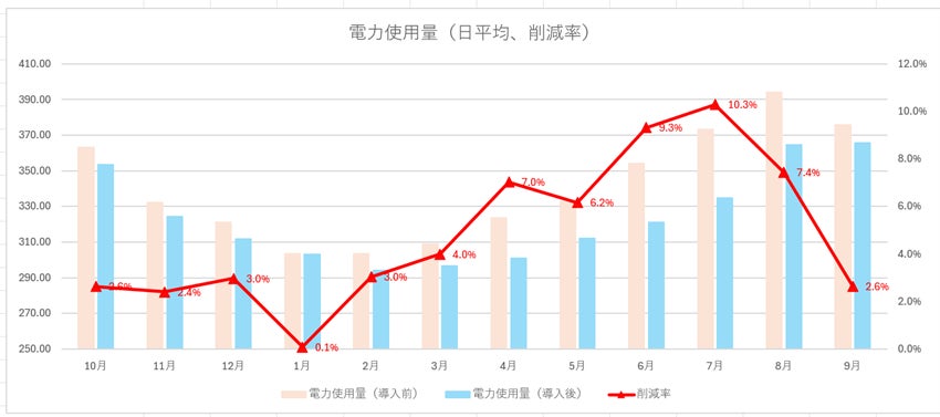 下表は、QTnetが作成した、2022年10月~2024年9月までにおける、電力使用量(1日あたりの平均値)を月ごとに比較したものです。SPACECOOLを導入した2023年9月15日から電力使用量削減の効果が現れ、特に日射量が多く、7月に最大10.3%の削減率を確認できるなど、気温が高まる4月~8月にかけて大きな効果を得られたことを確認できました。