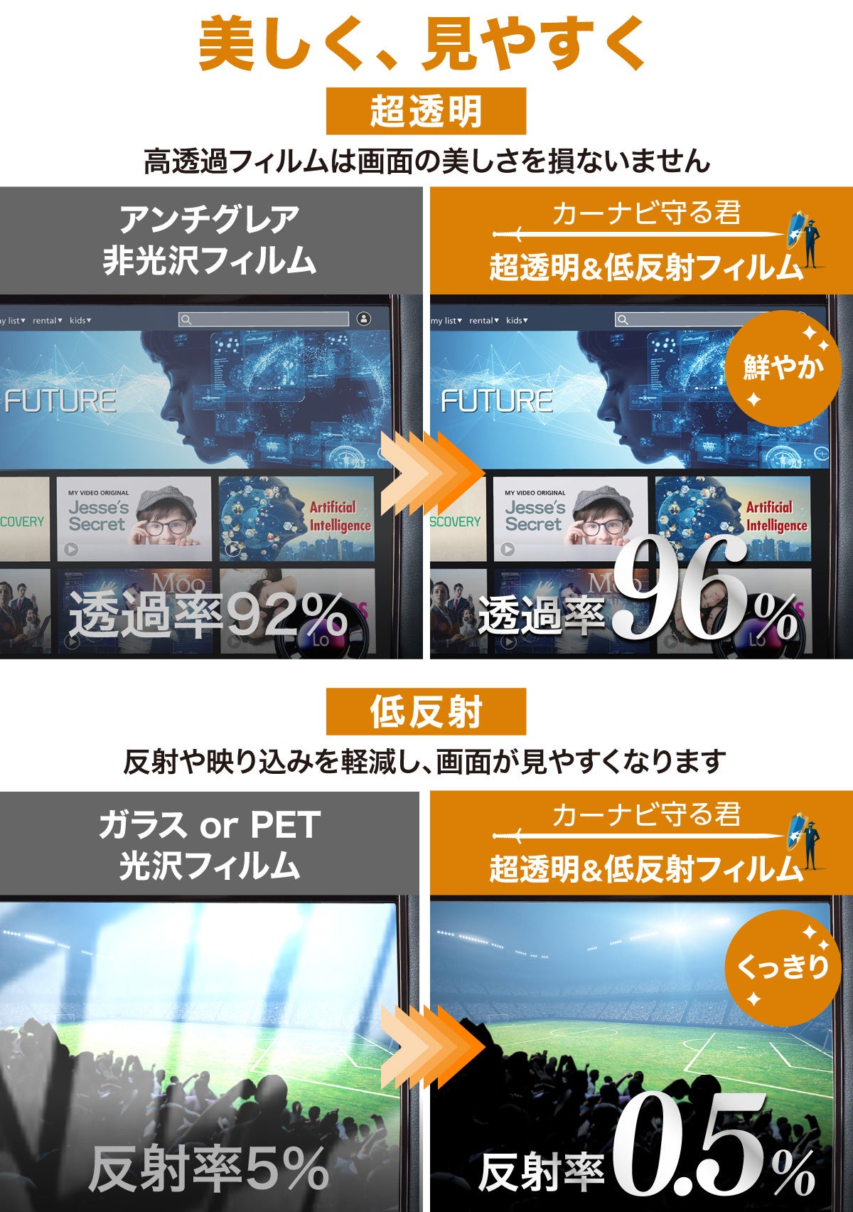 反射率はわずか0.5%の低反射。反射や映り込みを軽減し、明るい車内でも画面が見やすくなります。
