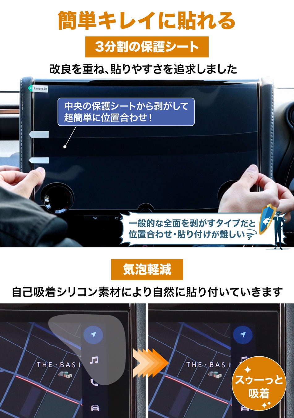 保護シートを「3分割」にすることにより、大きなナビ画面でも位置合わせがしやすく、簡単に貼り付けが可能です。また、フィルムの粘着面には特殊シリコン素材を採用。これによりフィルムは自己吸着し、気泡は入りづらく抜けやすくなります。