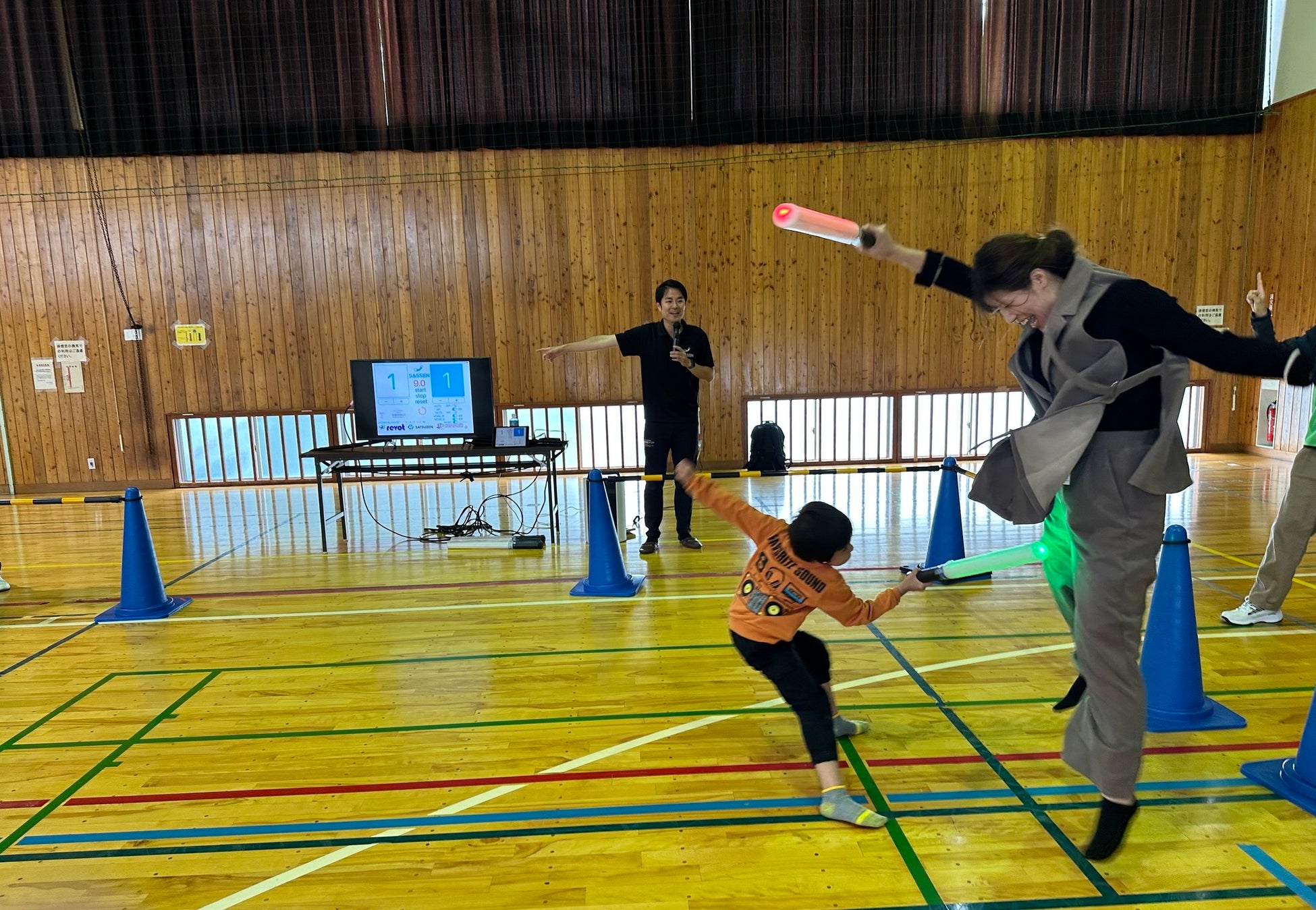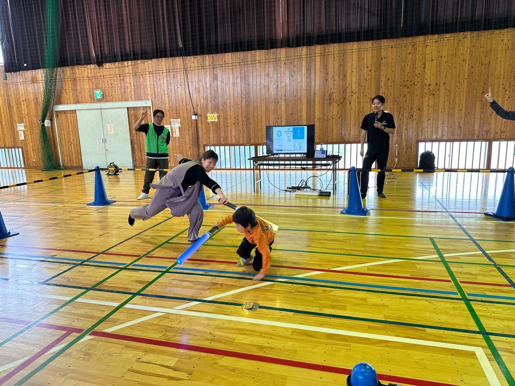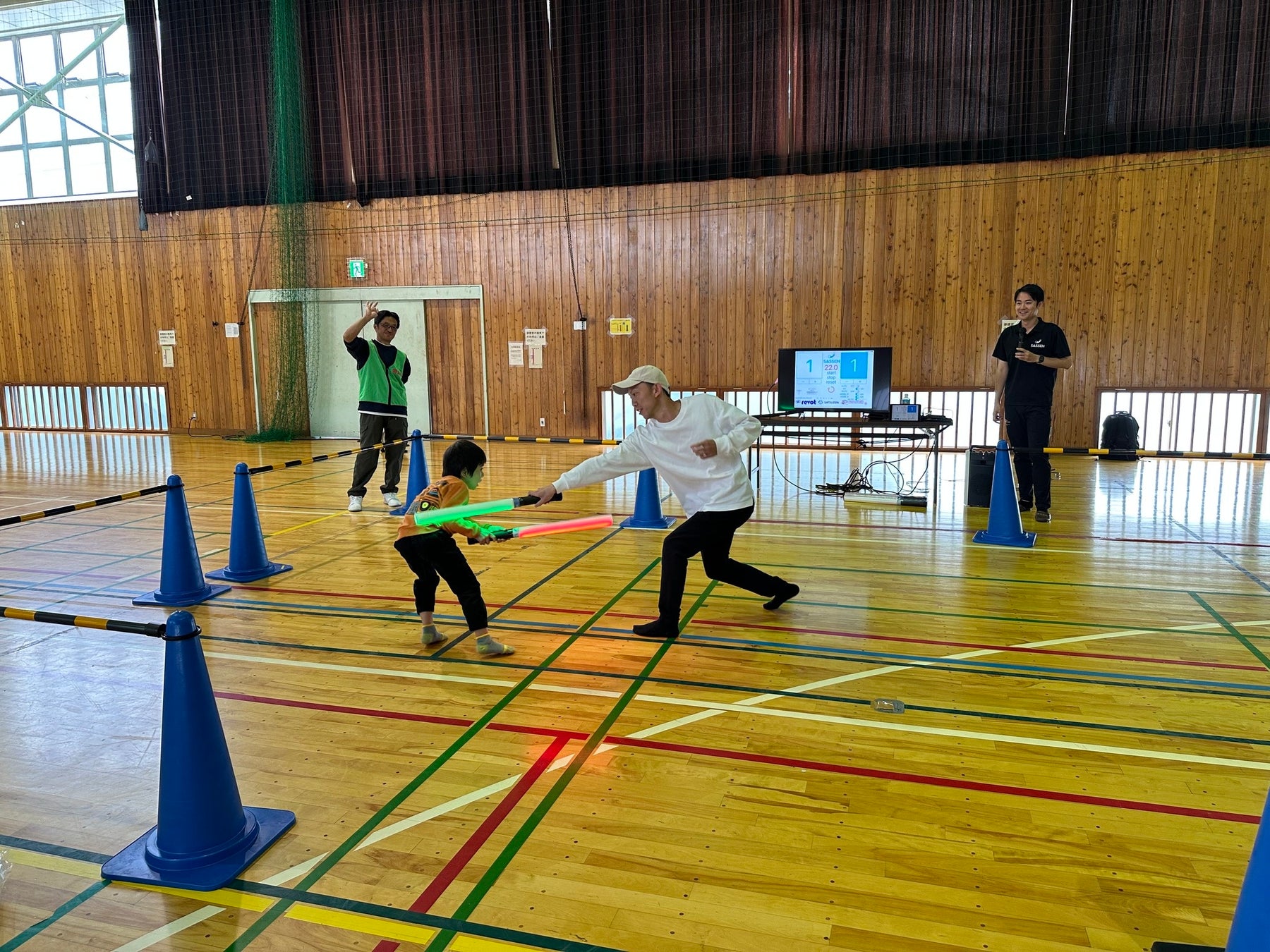 当日は、地域のご家族を中心に参加者が来場。光る刀とセンサーを用いた1対1のデジタルチャンバラに挑戦し、親子や夫婦での真剣勝負が次々と繰り広げられました。