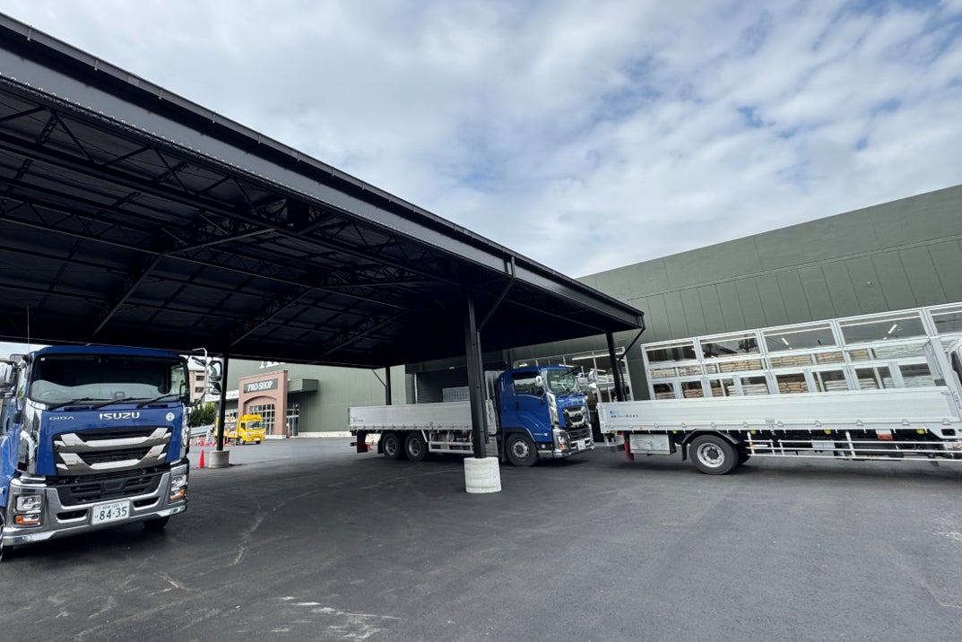 新たな取り組みとして、屋根付きの大型車両用積み込み場を設けます。トラックなどの大型車両がそのまま乗り入れて積み込みができるようになっており、早朝や天候の悪い日でも素早く商品を積み込むことができます。
