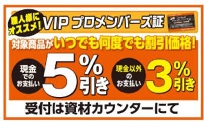 資材・工具関連商品を対象※に現金でのお支払い時には5%、現金以外のお支払い時には3%を割引するプロフェッショナルを応援する会員カードです。
