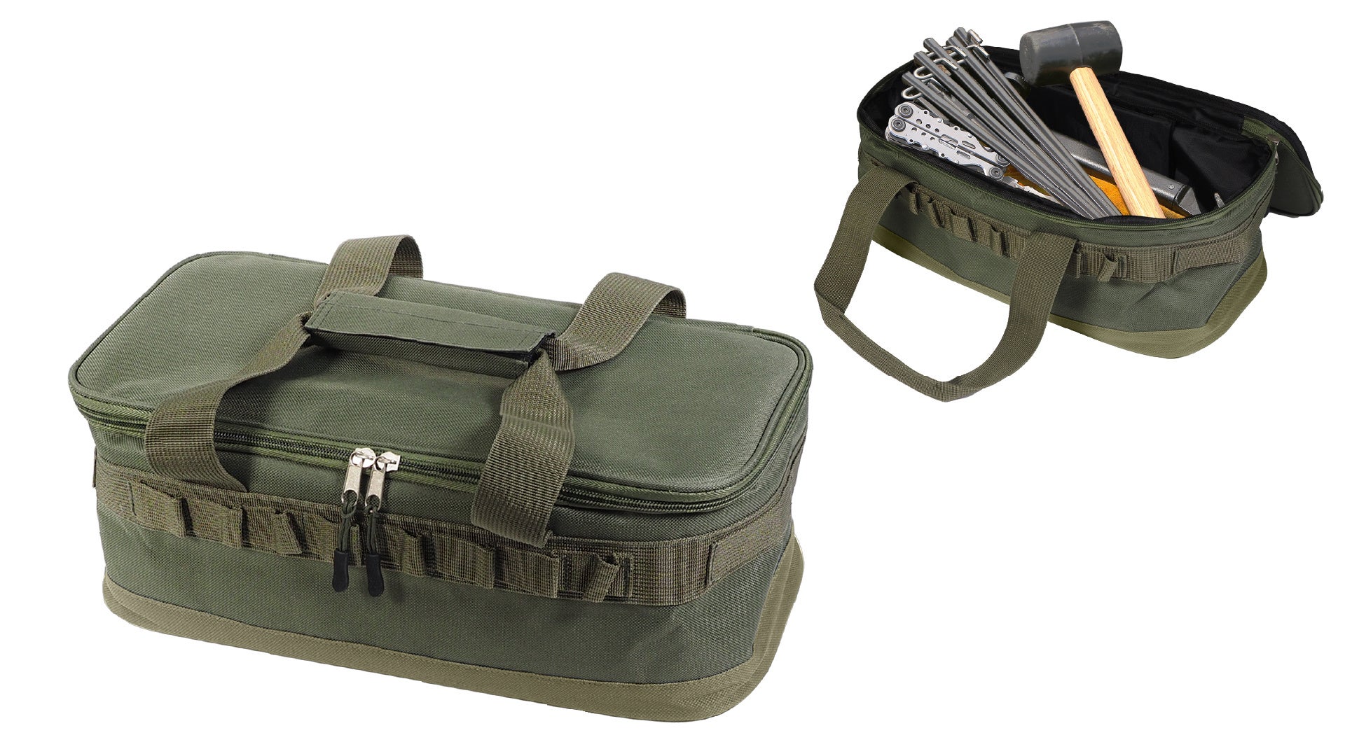 特徴:ペグやハンマーなど様々なツールの収納に。最大容量9Lで収納に便利なギアケース。奥行きが広いので工具やキャンプギアも楽々収納できます。手提げタイプで持ち運べるので、キャンプ時以外でもマルチに使える収納アイテムです。