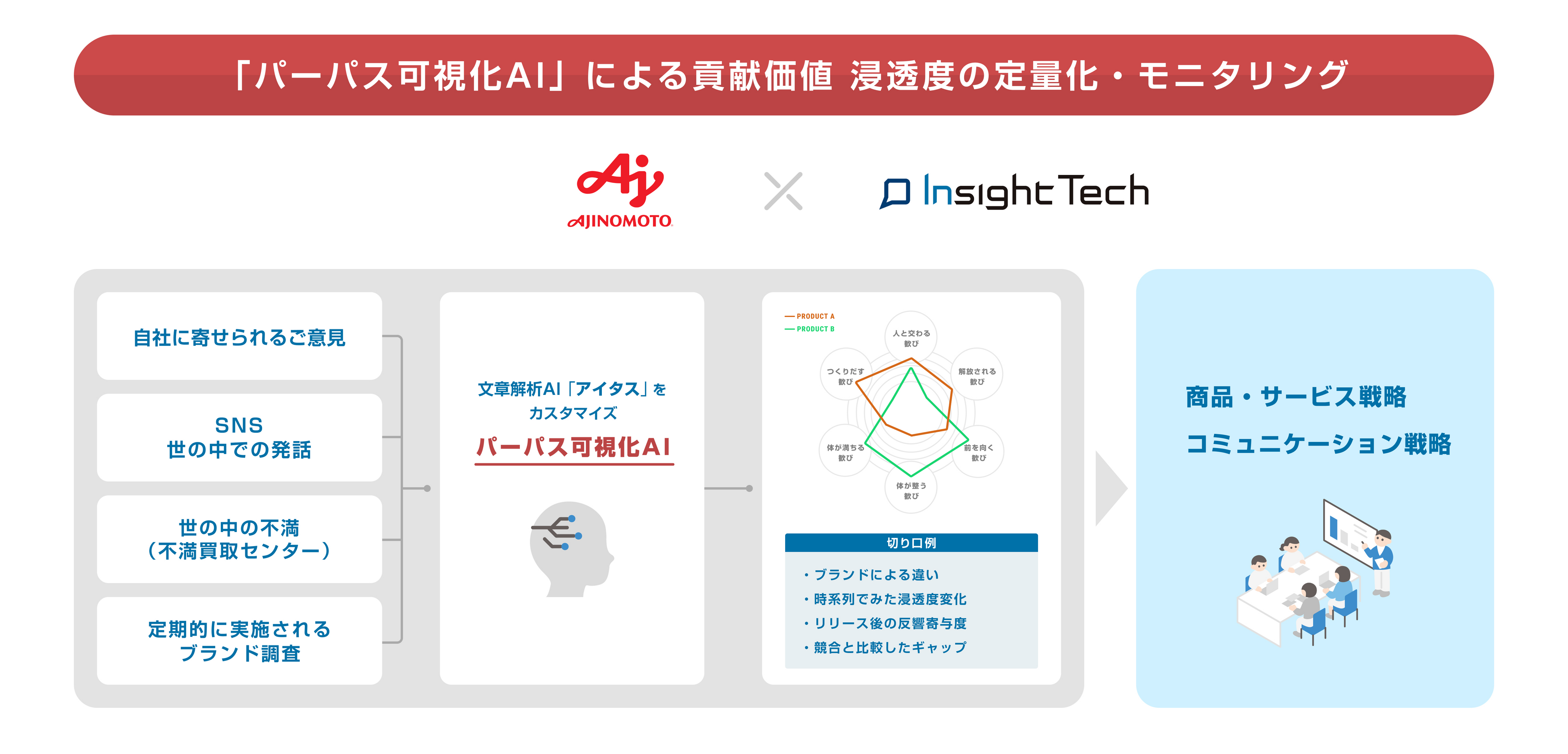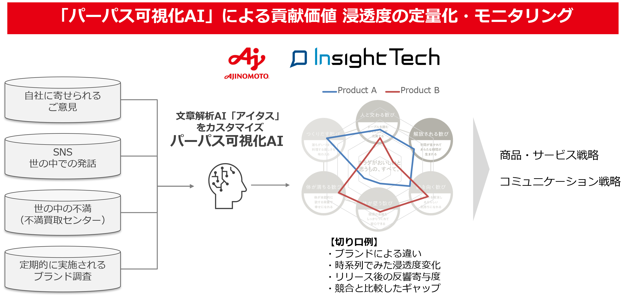 本取り組みでは、主要10ブランドを対象に、味の素グループに寄せられるお客様のお問合せに加え、SNS上での発話や、Insight Techが運営する「不満買取センター」に寄せられる不満といったVoC(Voice of Customer)のテキストデータをAIで解析し、各ブランドにおいて貢献価値がどの程度浸透しているかを定量的に評価します。