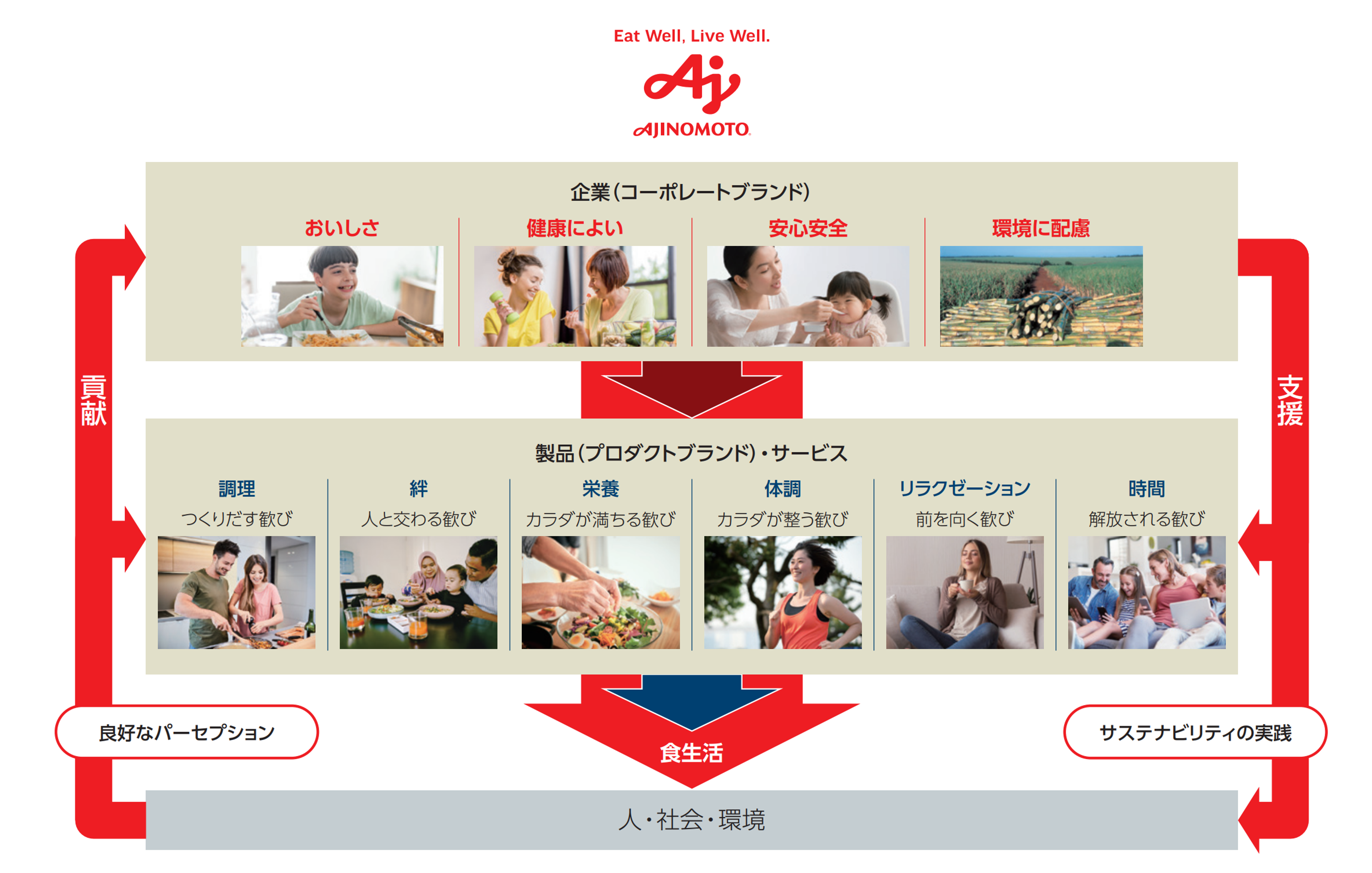 味の素グループは、企業の信頼を高め製品・サービスをサポートする4つの支援価値と、お客様のウェルネスにつながる6つの貢献価値を、製品やサービスを通じて体験・実感いただくことで、さらなるブランド価値向上を図ります。