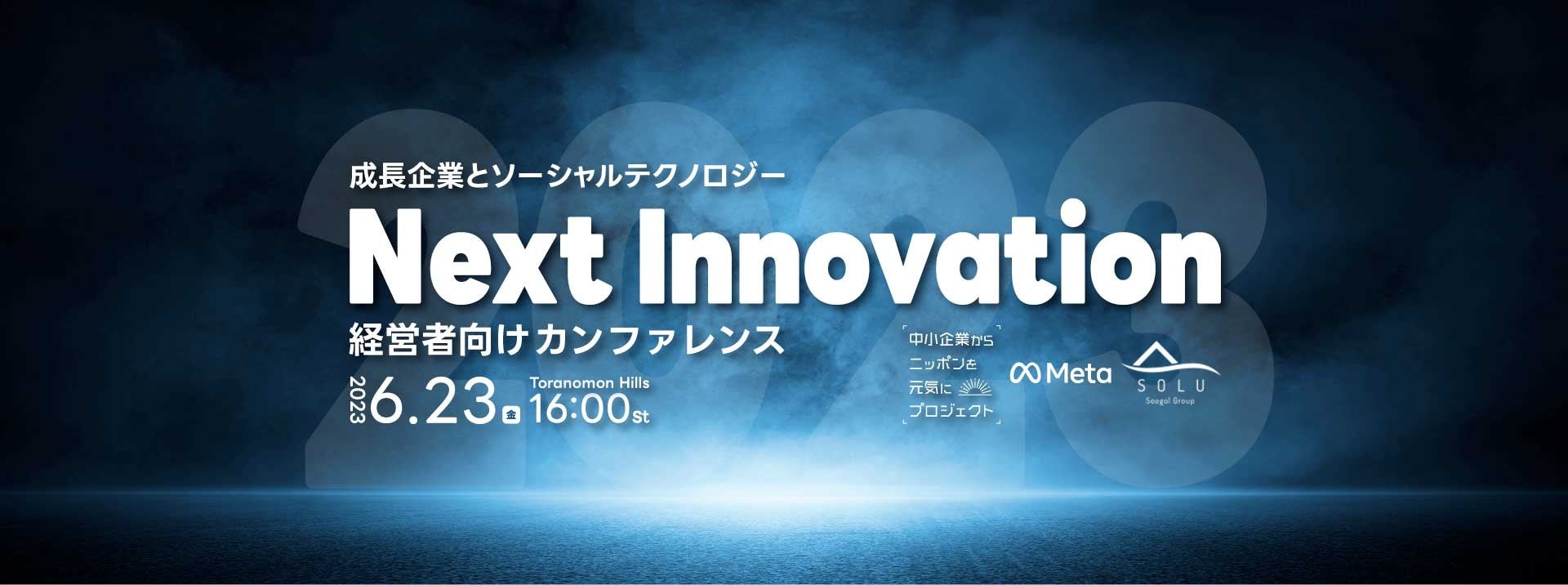 経営者向け「Next Innovation 2023」カンファレンスでは中小企業が変化の激しい現代社会を突き抜けていくためにオンライン販売、マーケティング、クラウドサービス活用、データ分析、AI導入など新たなデジタルテクノロジーを駆使し、効率化と競争力の強化を図ることが重要だと考えています。「中小企業からニッポンを元気にプロジェクト」では、Facebook Japan、ソルー株式会社を登壇者としてお迎えし、成長企業の経営者に向けたカンファレンスを開催します。