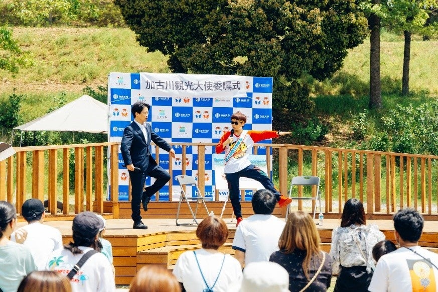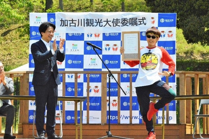 当日は、観光大使となったバイク川崎バイクさんによるステージライブが実施され、その後、加古川市岡田市長と加古川観光協会大辻理事からバイク川崎バイクさんへ委嘱状と記念品が贈られました。バイク川崎バイクさんは「僕、観光大使に、抜擢。BKB!」とコメントし、「光栄です。ありがとうございます。」と感謝を述べました。記念品授与の際には、加古川市のソウルフードであるかつめしについて、「ばり、かつめし、美味。BKB!」と自信のネタを使ってアピールし、会場を大いに沸かせました。
