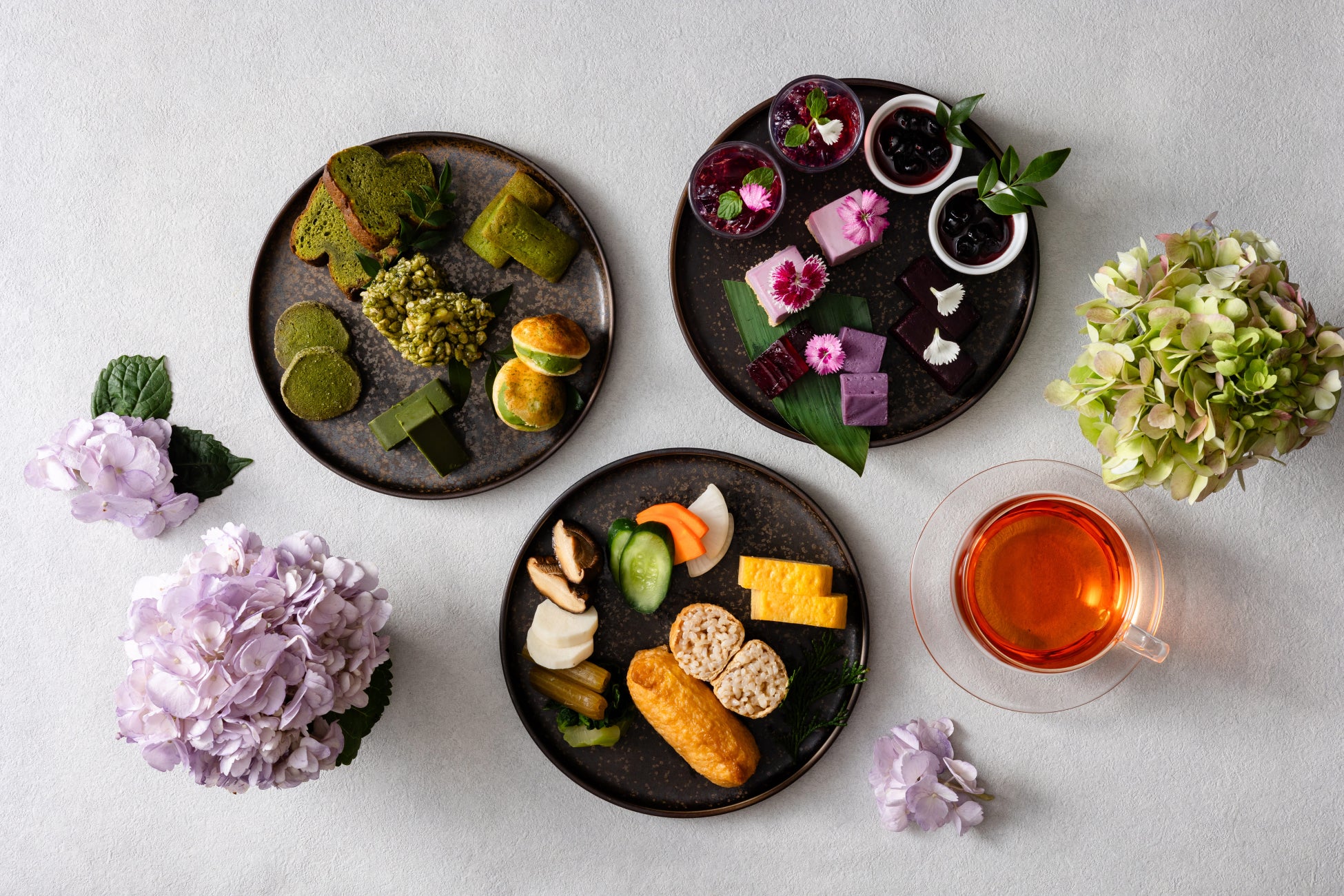 2025年5月~6月は「紫陽花」をテーマに、鮮やかな色合いが美しいスイーツと、新緑を思わせる抹茶使ったスイーツなど、パティシエが作り上げた特別なアフタヌーンティーをご提供いたします。また、ウェルカムドリンクには、甘茶をご用意。アジサイ科アマチャの若葉を使ったお茶で、さっぱりとアイスティーにしてお愉しみいただけます。意匠を凝らした和洋様々なスイーツに加え、いなり寿司などご飯ものもセットし、ロンネフェルトの紅茶や宇治茶、知覧茶など、各種ドリンクとのペアリングもお愉しみください。