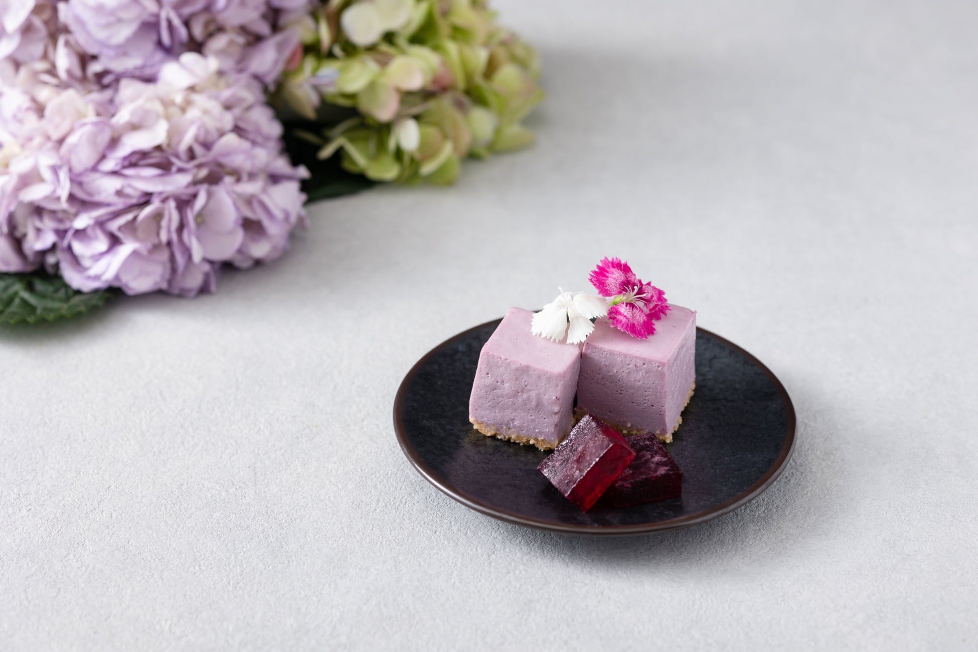 濃厚でふわふわ食感のレアチーズと、ホロホロ食感のクッキー生地を合わせ、紫陽花を連想したブルーベリーソースの酸味をアクセントに加えました。