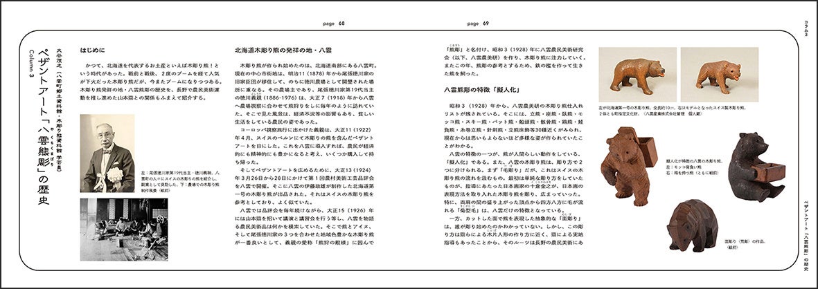 本書では、このわずか15年の間に全国各地で作られた木片(こっぱ)人形・木彫風俗人形を中心に、様々な制作品をその成り立ちとともに紹介しています。また、運動全体を俯瞰する解説や、同時期に作られるようになった北海道・八雲町の熊彫との関係、現在長野で作られている作品紹介など、農民美術に初めてふれる人に向けて様々な内容を収録した入門書です。