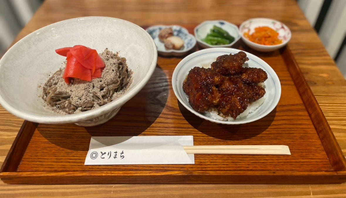 ・越前荏胡麻蕎麦、ソース鶏カツ丼、福井産旬の野菜ナムル盛り