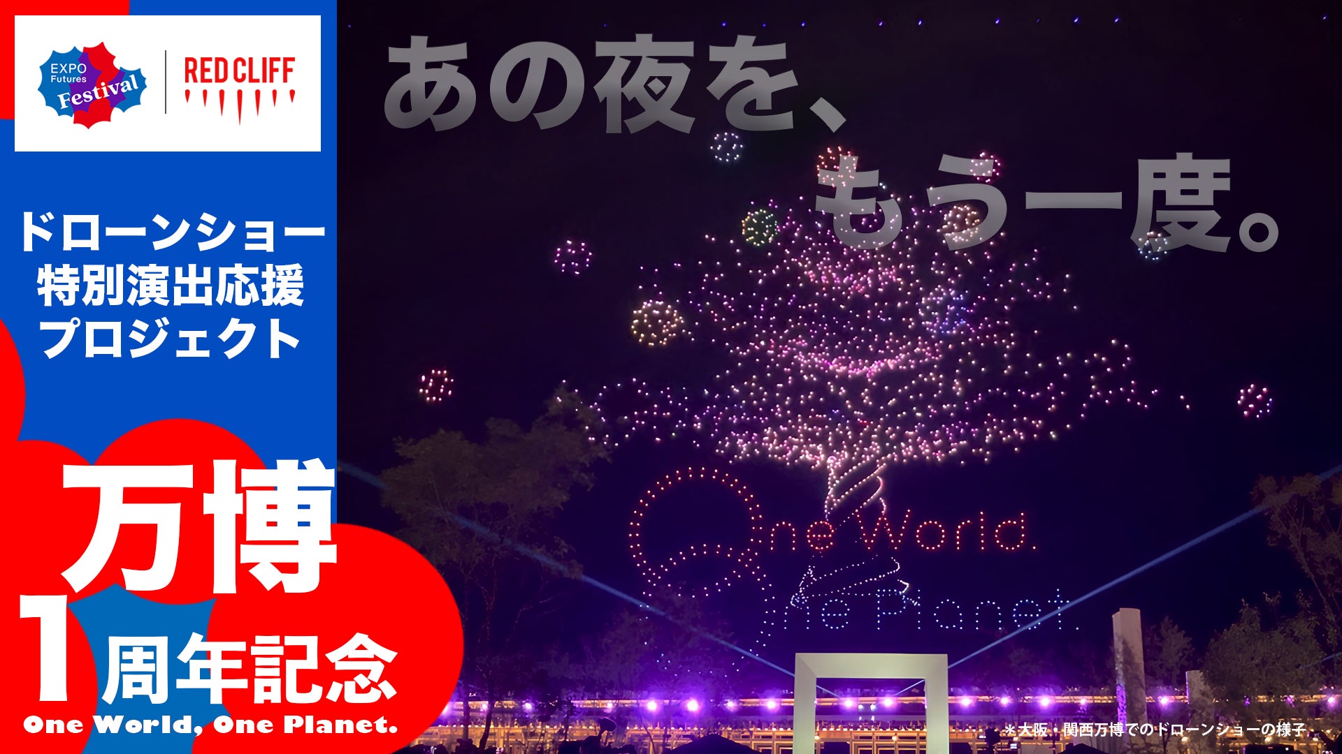 ドローンショーの企画・運営を手がける株式会社レッドクリフ(本社:東京都港区、代表取締役:佐々木 孔明、以下「レッドクリフ」)は、公益社団法人2025年日本国際博覧会協会が開催する大阪・関西万博1周年メモリアルイベント「EXPO2025 Futures」の第一弾となる開幕1周年イベント「EXPO2025 Futures Festival」に協賛し、2026年4月12日(日)に万博記念公園もみじ川芝生広場(大阪府吹田市)にて、万博期間中に多くの来場者を魅了したドローンショー「One World, One Planet.」を一夜限りの特別版として実施いたします。