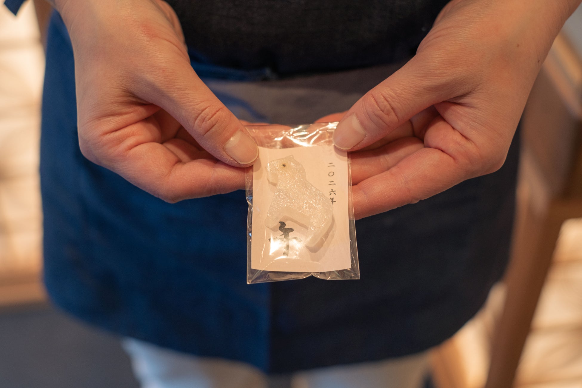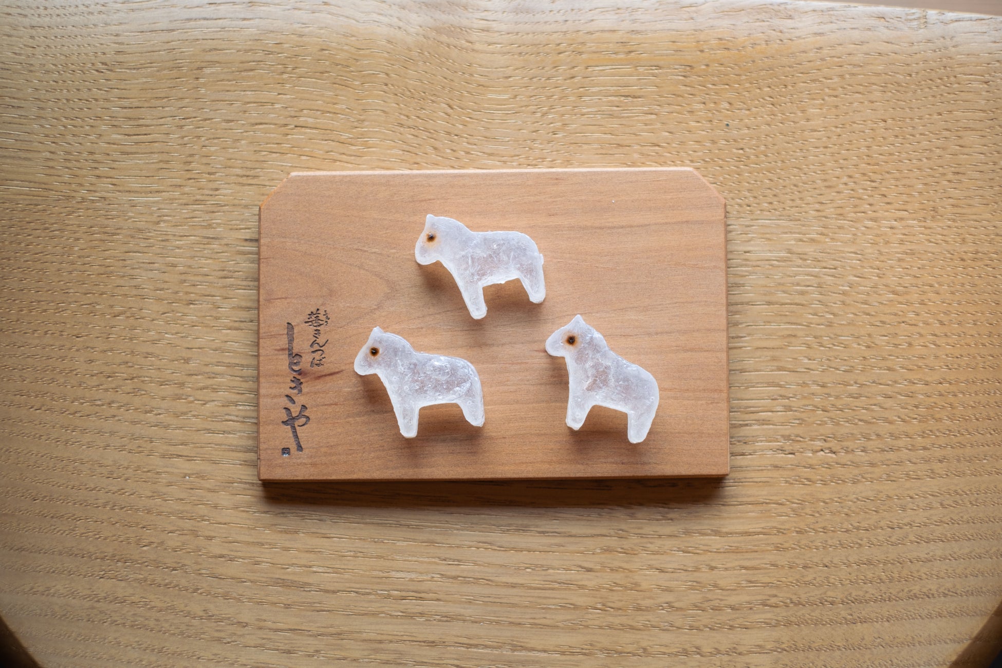 お渡しする琥珀糖は、型から手づくりしています。干支である午の琥珀糖は普段は「ときのはこ」でしか食べられないもの。外はシャリっと中はプルンとした食感が後を引く、優しい甘さが特徴の琥珀糖をぜひお召し上がりください。