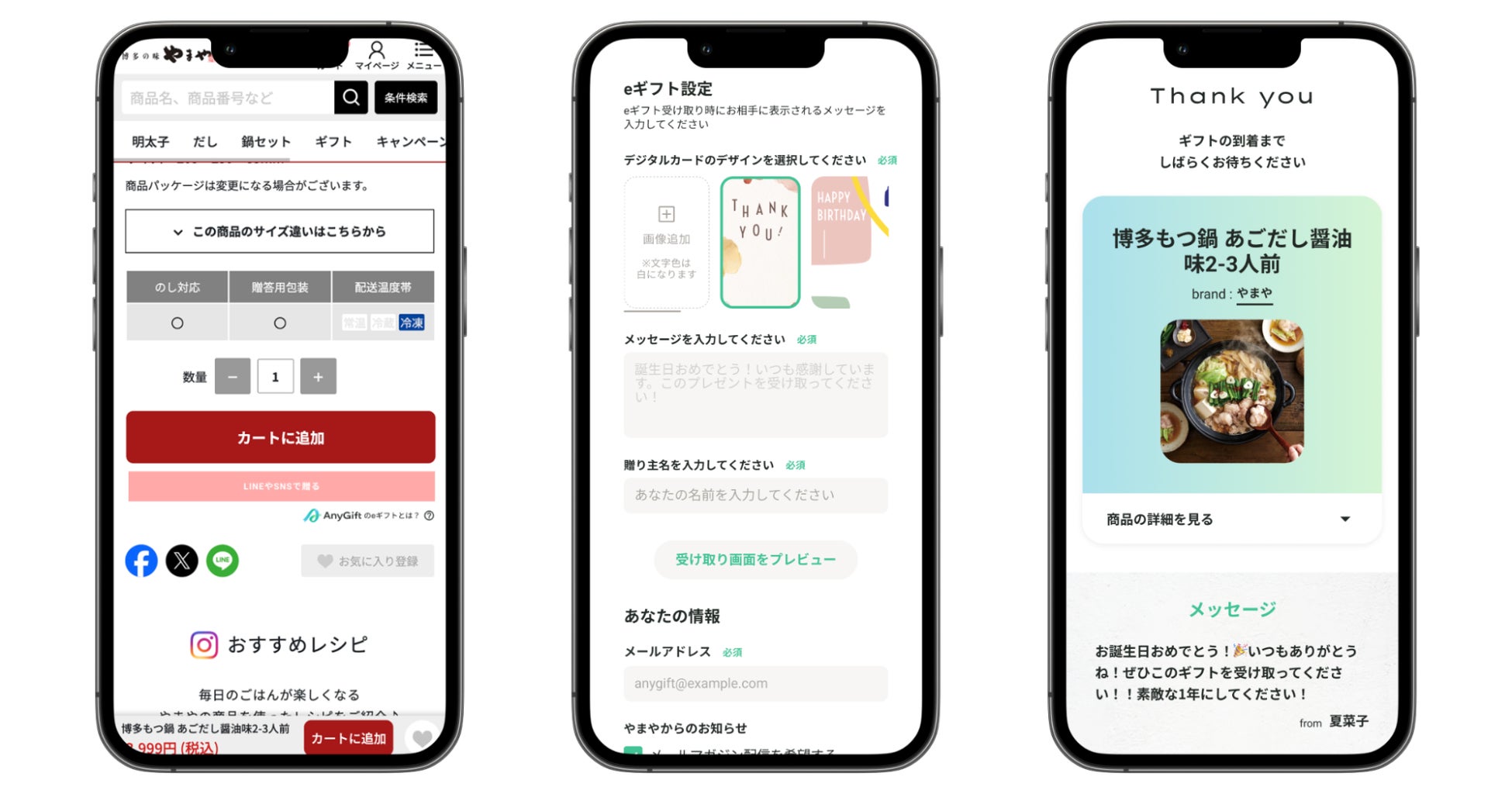今回、当社のAnyGiftの提供により、「博多の味やまや 公式オンラインショップ」にて一部商品がeギフトとして贈れるようになります。