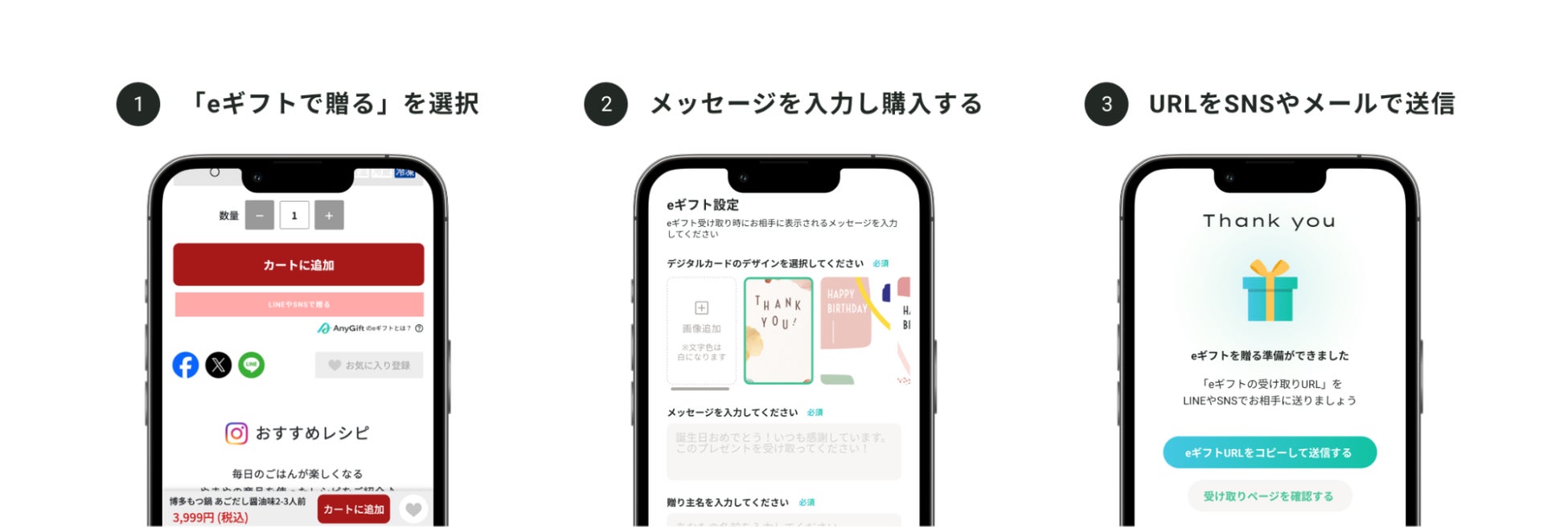 AnyGiftは、相手の住所を知らなくてもLINEやメールで商品を贈ることができる“eギフト機能”を、ECサイトに組み込むことができるサービスです。