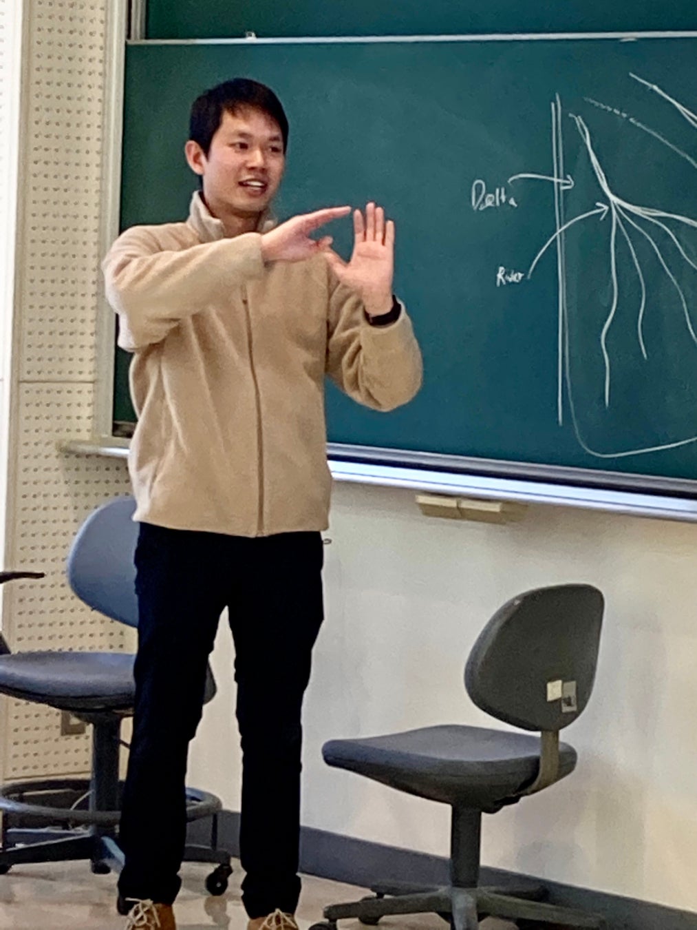 コア・トラン氏はオランダのユトレヒト大学を卒業後、イギリスのオックスフォード大学で社会学の修士号を取得したベトナム出身のデータサイエンティストです。トラン氏は海面上昇が生じるメカニズムを説明し、地球温暖化のシナリオのパターンによって、海面が何メートル上昇する可能性があるかを解説しました。そして、オックスフォード大学在学中に取り組んだ研究結果から、2100年に海面が1メートル上昇すると、ベトナム沿岸部に住む134万5千人の人々が住宅を失うという予想を説明しました。講義の後は、受講した学生に対して「海面水位の上昇が日本にどのような影響をもたらすと思うか」、「海面水位の上昇の問題に日本政府はどのように対処すべきか」というディスカッションクエスチョンを投げかけ、ディスカッションをリードしました。その後、ベトナムはコーヒーの輸出がブラジルに次いで世界2位であることや、ベトナムにはカフェ文化があることなど、いろいろな話題について交流しました。