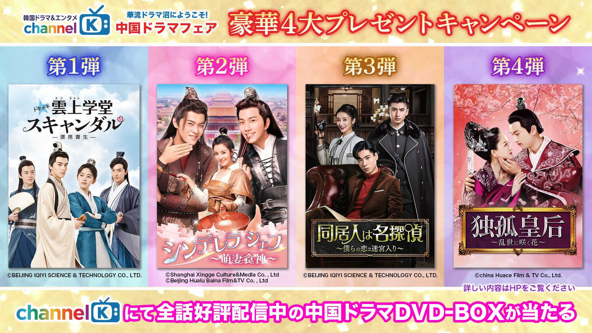 なんと、本記事でもご紹介したチャンネルKにて全話好評配信中の「シンデレラ・シェフ~萌妻食神~」、「独孤皇后〜乱世に咲く花〜」、「トキメキ☆雲上(ユンシャン)学堂スキャンダル~漂亮書生~」、「同居人は名探偵~僕らの恋は迷宮入り~」のDVD-BOXが当たる豪華4大プレゼントキャンペーンを本日6月5日(月)よりスタート!キャンペーンに関する詳しい内容や応募方法はチャンネルKの公式サイトをご確認ください。