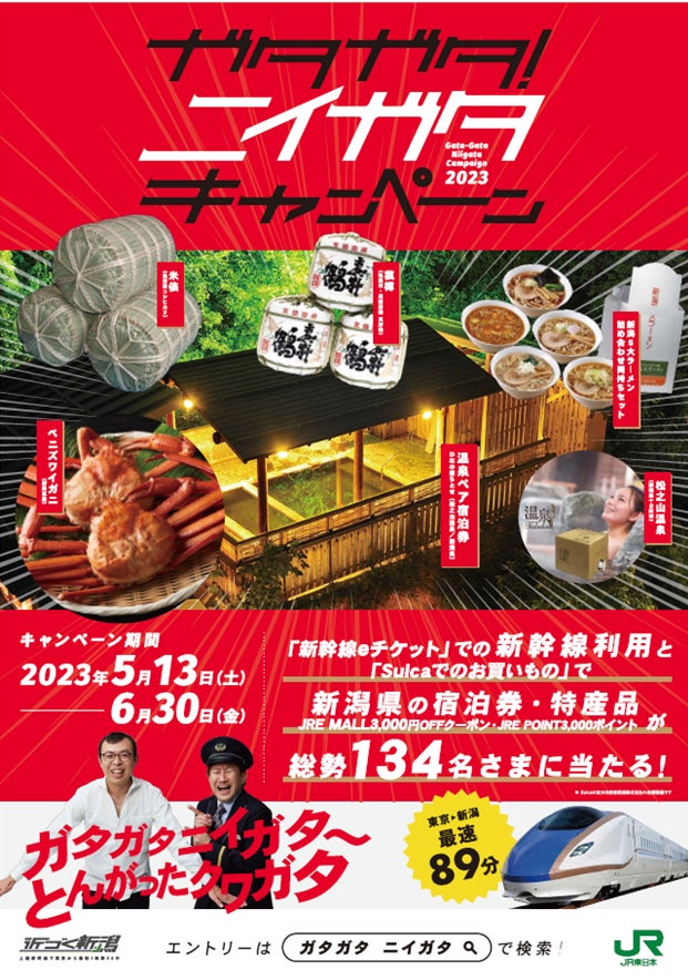 「新幹線eチケット」利用と、「Suicaのお買いもの」で新潟の温泉旅館ペア宿泊券や特産品等が当たる「ガタガタ ニイガタ キャンペーン」(2023年5月13日(土)~6月30日(金))の告知ポスターに「ジョイマン」が登場します。