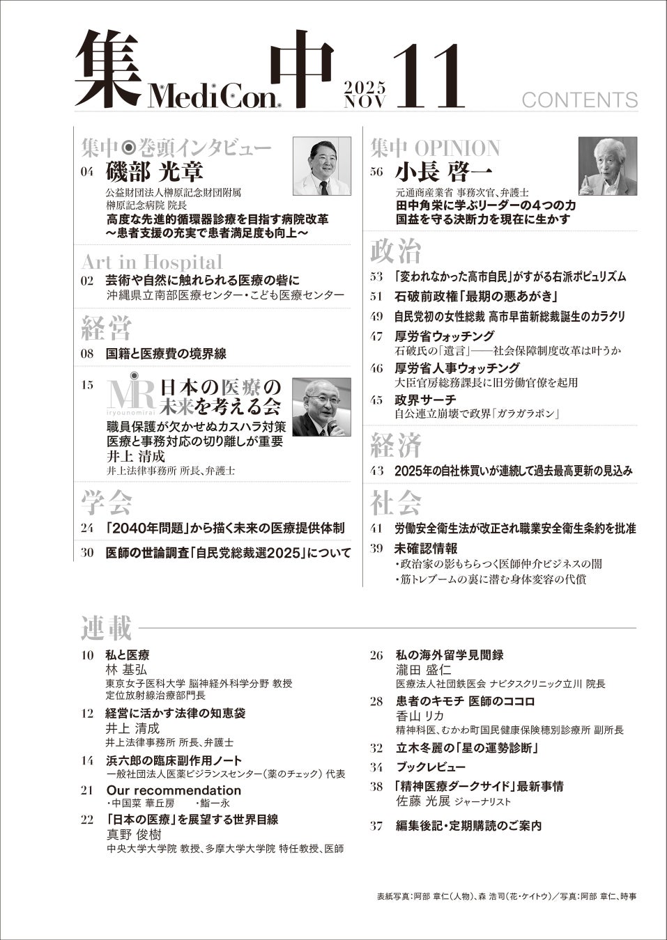 医療情報誌 月刊『集中』2025年11月号 巻頭インタビュー 磯部 光章・公益財団法人榊原記念財団附属 榊原記念病院 院長/集中OPINION 小長 啓一・元通商産業省 事務次官、弁護士 他