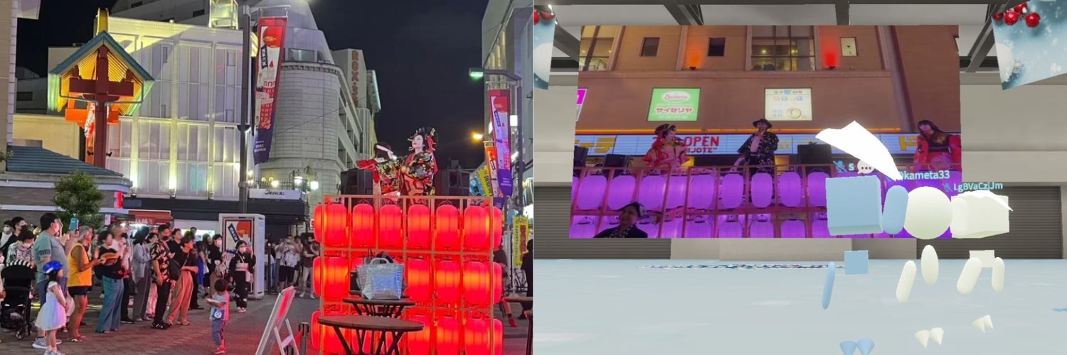 浅草夜祭の「Asakusa 69 Free Show」で行われている「盆踊り」の様子を、メタ・ワールドフェス2023冬の特設メタバース会場にライブ配信で放映しました。日本舞踊家 孝藤右近氏を中心にタオルをふる・拍手・ジャンプ、という3つのアバターアクションを用い、現地の参加者とアバターが同時にジャンプを行うなど、リアルとメタバースがデジタルの壁を越え一緒に盆踊りを踊りました。物理的な空間とデジタルの空間がこのように一体化したことで、参加者たちはネットワークを超えてひとつのコンテンツを同時に楽しむ体験を共有する新たな交流の場が創出されました。