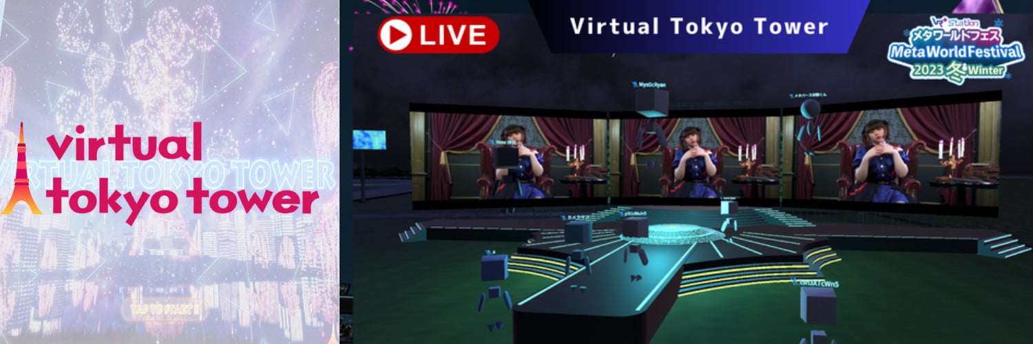 株式会社メタバースジャパンが運営する東京タワー公式のメタバース空間「Virtual Tokyo Tower」とコラボレーションし、アーティストやお笑い芸人が多数出演する、超スペシャル企画、“Virtual Tokyo Tower with bless4”を開催いたしました。仮想現実ならではの特殊な演出として、東京タワー横に設置された巨大な3面スクリーンにアーティストを投影し、まるで実際にその場にいるかのような没入感のあるステージとなりました。総勢約100名が特設ステージの上でパフォーマンスを披露し、アバターはタオルや拍手などのアクションで応援しました。