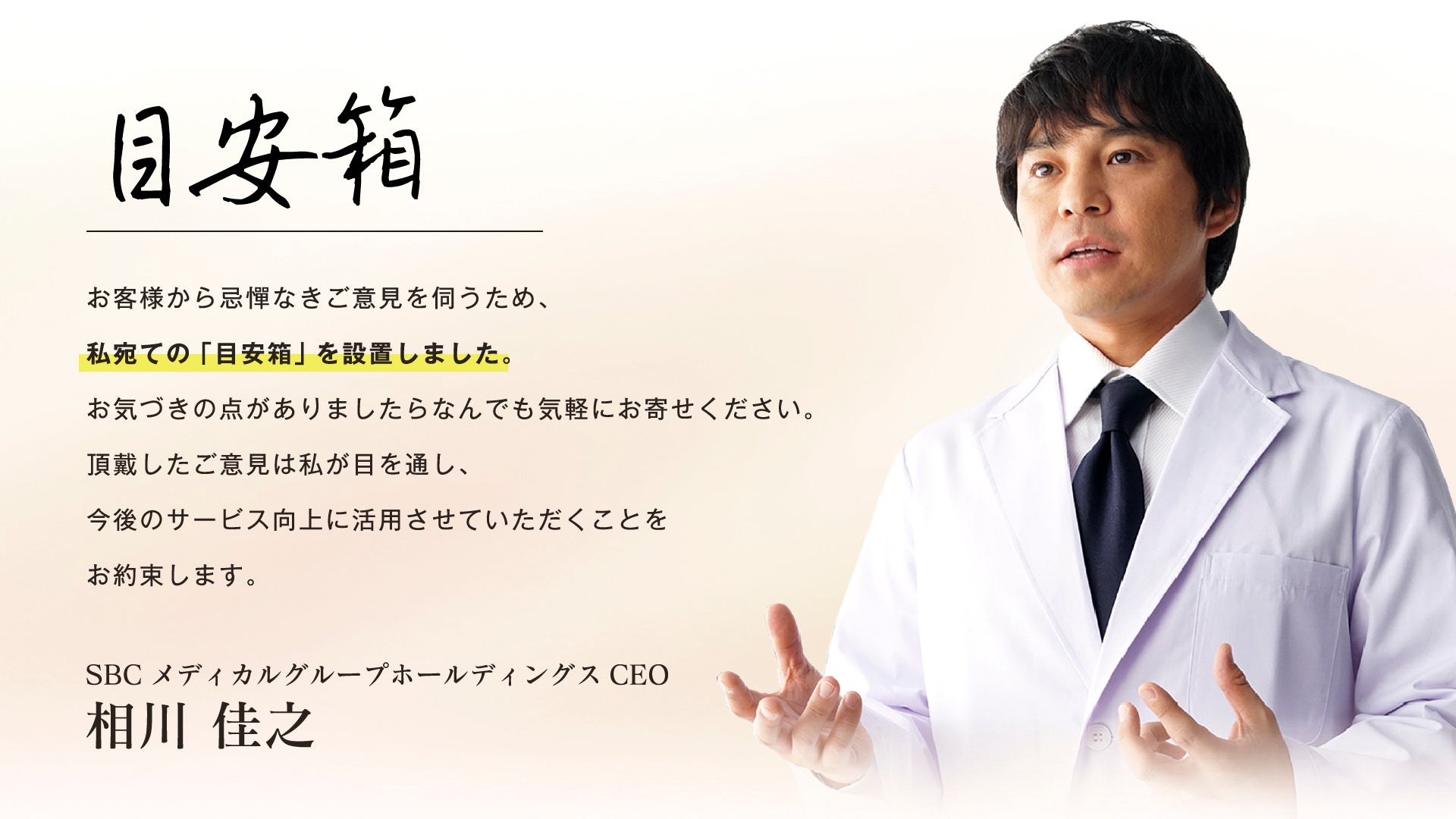 SBCメディカルグループホールディングス(米国カリフォルニア州 CEO:相川佳之)の連結子会社であり、全国の医療機関への経営支援事業を展開するSBCメディカルグループは、お客様から創業者 相川佳之に直接声を届けることができる「目安箱」を公式サイト内に設置。2024年9月1日(日)より運用を開始し、さらなるサービス向上を目指します。