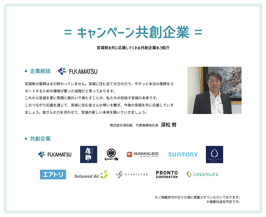 『企業統括』には『株式会社深松組 代表取締役社長 深松努氏』をお迎えし、県内の企業様(伝承千年の宿 佐勘、時音の宿 湯主一條、ハミングバード・インターナショナル、サントリー株式会社 東北営業本部 など)のご支援のもと、連携して活動してまいります。