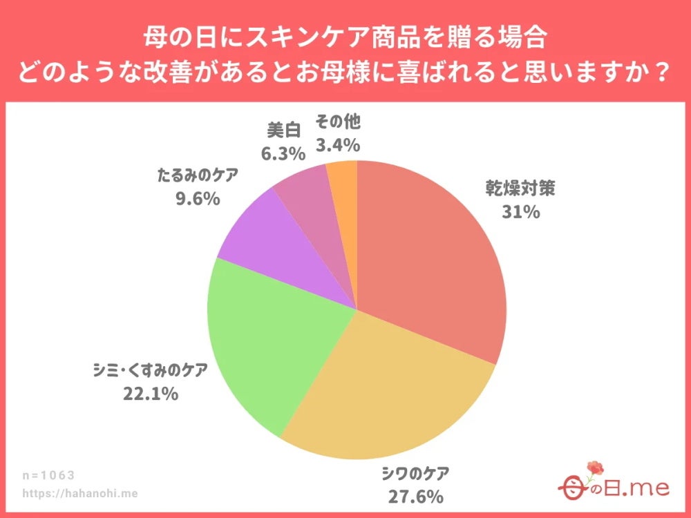 このアンケート結果から、母の日にスキンケア商品を贈る際には「保湿」や「エイジングケア」が重視されることが分かりました。特に、「乾燥対策」31%が最も多く選ばれており、年齢を重ねた肌の悩みとしてうるおい不足を気にする人が多いことがうかがえます。次いで、「シワのケア」27.6%や「シミ・くすみのケア」22.1%が続き、年齢による肌の変化に対応したスキンケアアイテムが求められていることが分かります。「たるみのケア」9.6%や「美白」6.3%といった項目も一定の支持を集めており、単なる保湿だけでなく、ハリや透明感を意識したスキンケアニーズもあることが分かりました。