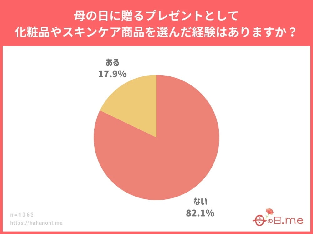 このアンケート結果から、母の日のプレゼントとして化粧品やスキンケア商品を選ぶ人は少数派であることが分かりました。「ない」と回答した人が82.1%と大多数を占めており、母の日のギフトとしては、食品やお花など、より一般的な選択肢が優先されていることがうかがえます。化粧品やスキンケア商品は、肌質や好みが分かれるため、選び方が難しいという回答が大半を占めていました。一方で、「ある」と回答した17.9%の人は、母親の美容やスキンケアに関心を持ち、日常的に使えるアイテムを贈ることで喜んでもらいたいという回答がありました。
