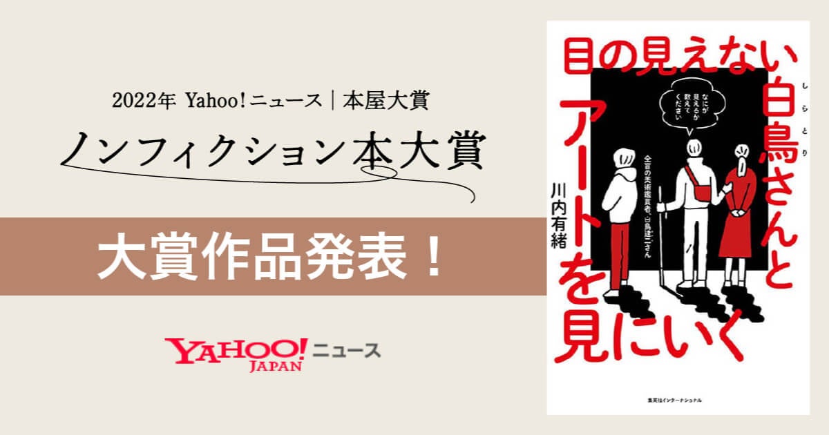 ヤフー株式会社が運営する日本最大級のインターネットニュース配信サービス「Yahoo!ニュース」と、書店員が「面白かった」「お客様に薦めたい」と思った本への投票で決定する「本屋大賞」が連携した「2022年 Yahoo!ニュース | 本屋大賞 ノンフィクション本大賞」は、全国の書店員の投票によるノミネート6作品の選出と、その後の二次選考を経て、大賞作品を川内有緒さんの「目の見えない白鳥さんとアートを見にいく」(集英社インターナショナル)に決定しました。