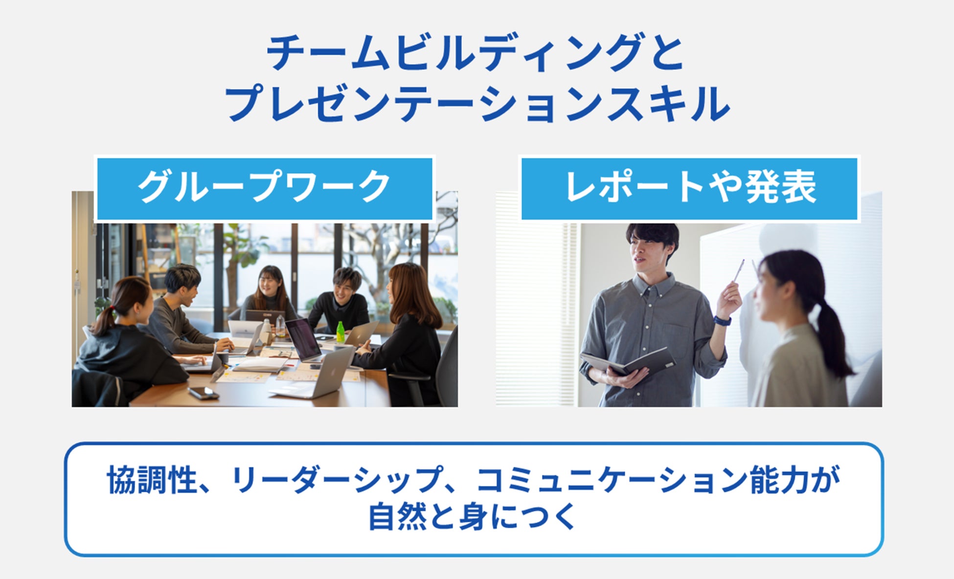 グループワークでの討論やレポート、プレゼンテーションを通じ、協調性・論理的思考・表現力を総合的に強化。