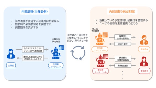 サービスの開始に先行し、マルチAIエージェントの一例として、会議の主催者と参加者の予定を自動的に調整し、最適な会議日時を確定するスケジュール調整エージェントの開発を行いました。AIエージェント同士が、主催者や参加者に代わって自律的に調整を行うことで、人手を介した調整時間の大幅な削減が期待できます。