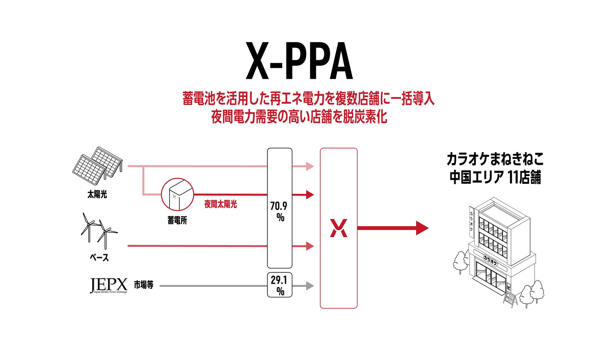 株式会社パワーエックス(本社:東京都港区、取締役 代表執行役社長CEO:伊藤 正裕)は、株式会社コシダカ(本社:東京都渋谷区、代表取締役社長:腰髙 博)が中国地方で展開する「カラオケ まねきねこ」の11店舗に対し、蓄電池を活用した電力サービス「X-PPA」による電力供給を、2025年6月から開始します。