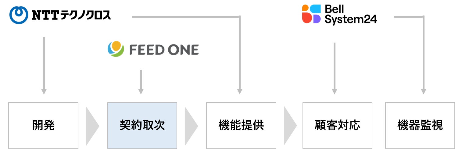 フィード・ワンは同社が保有する肥育牛生産者ネットワークに対し、本サービスの取次を行い、NTTテクノクロスがソリューション開発、ベルシステム24がカスタマーサポート等をそれぞれ担当することで、本サービスの普及を加速し、肥育牛生産者の課題解決と国産牛肉の生産量拡大に寄与してまいります。