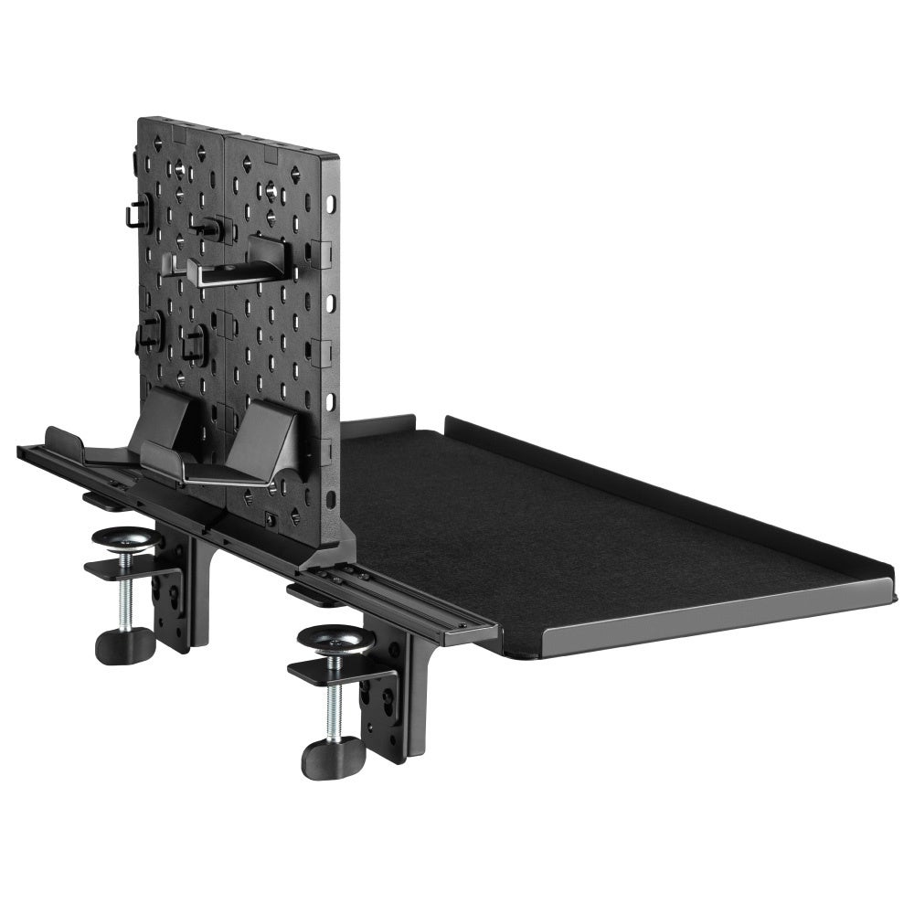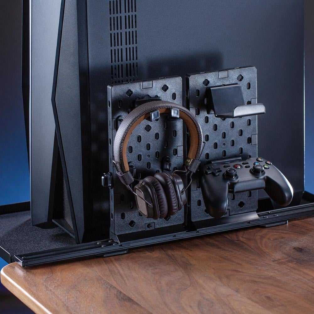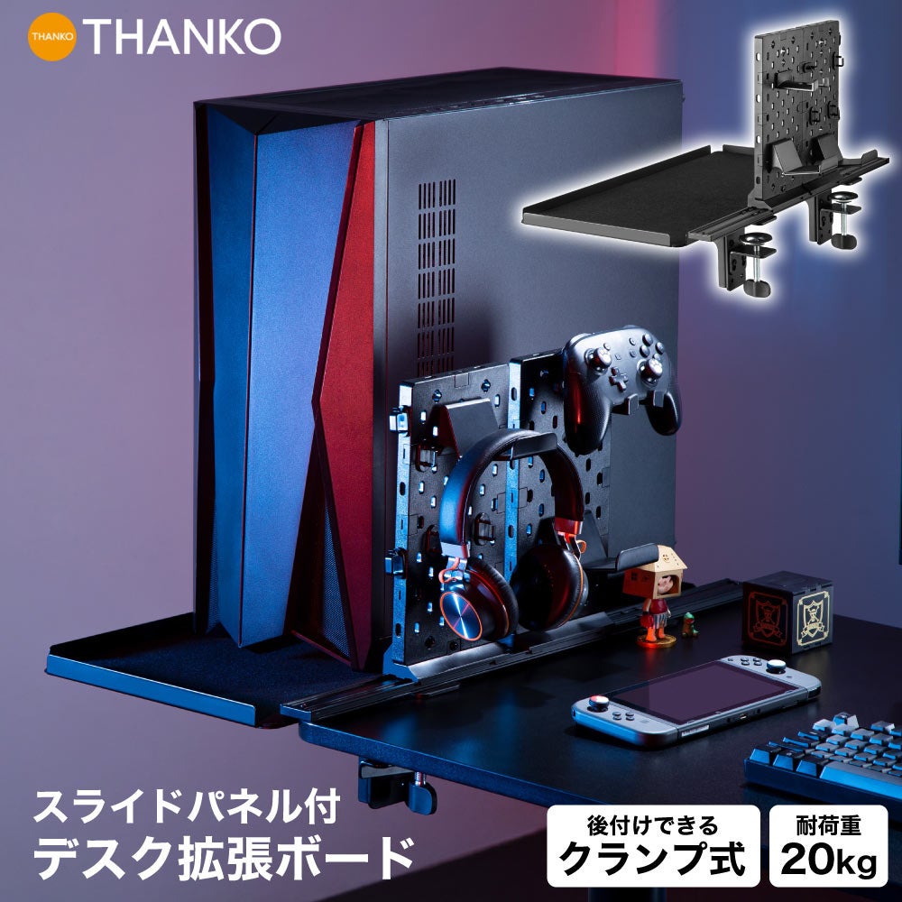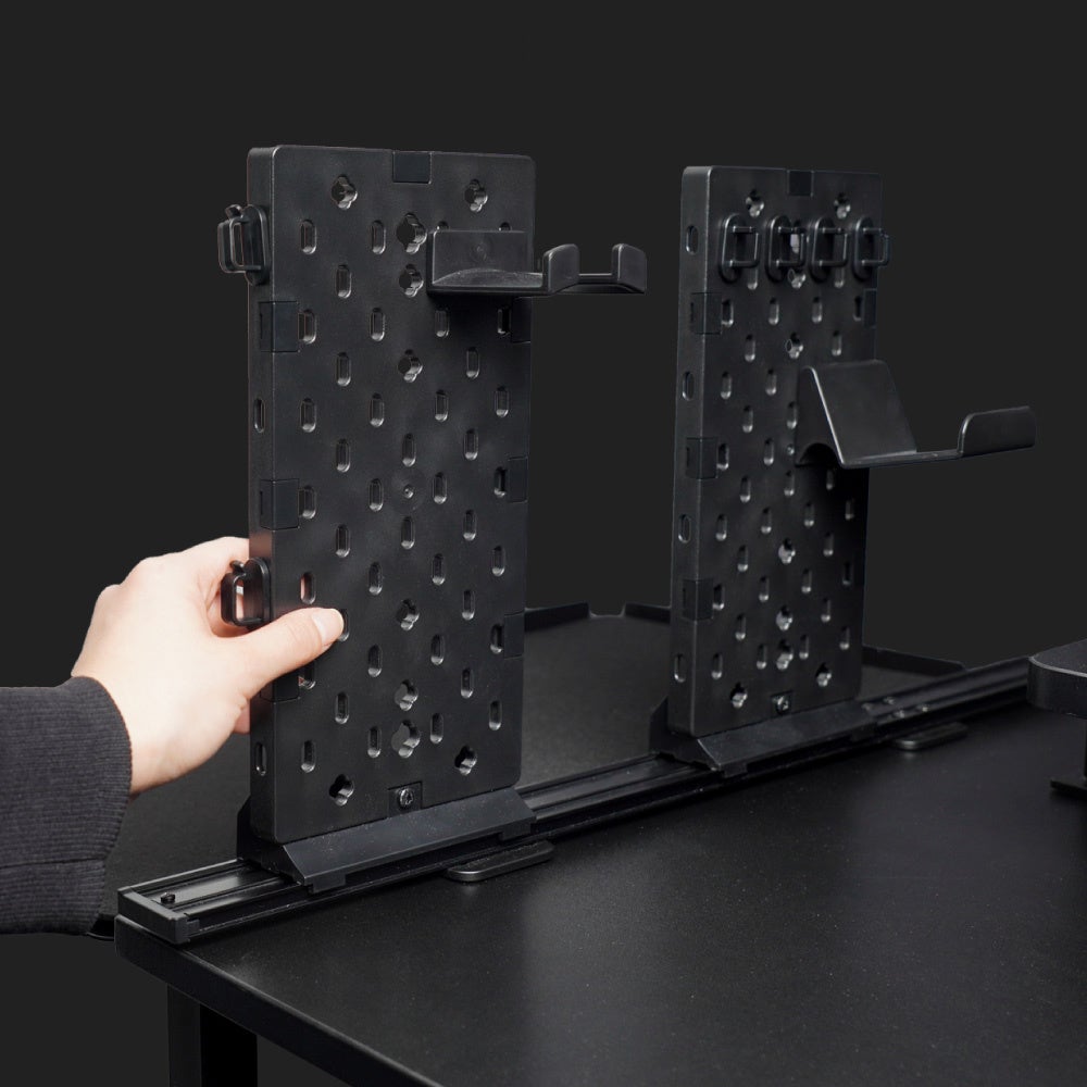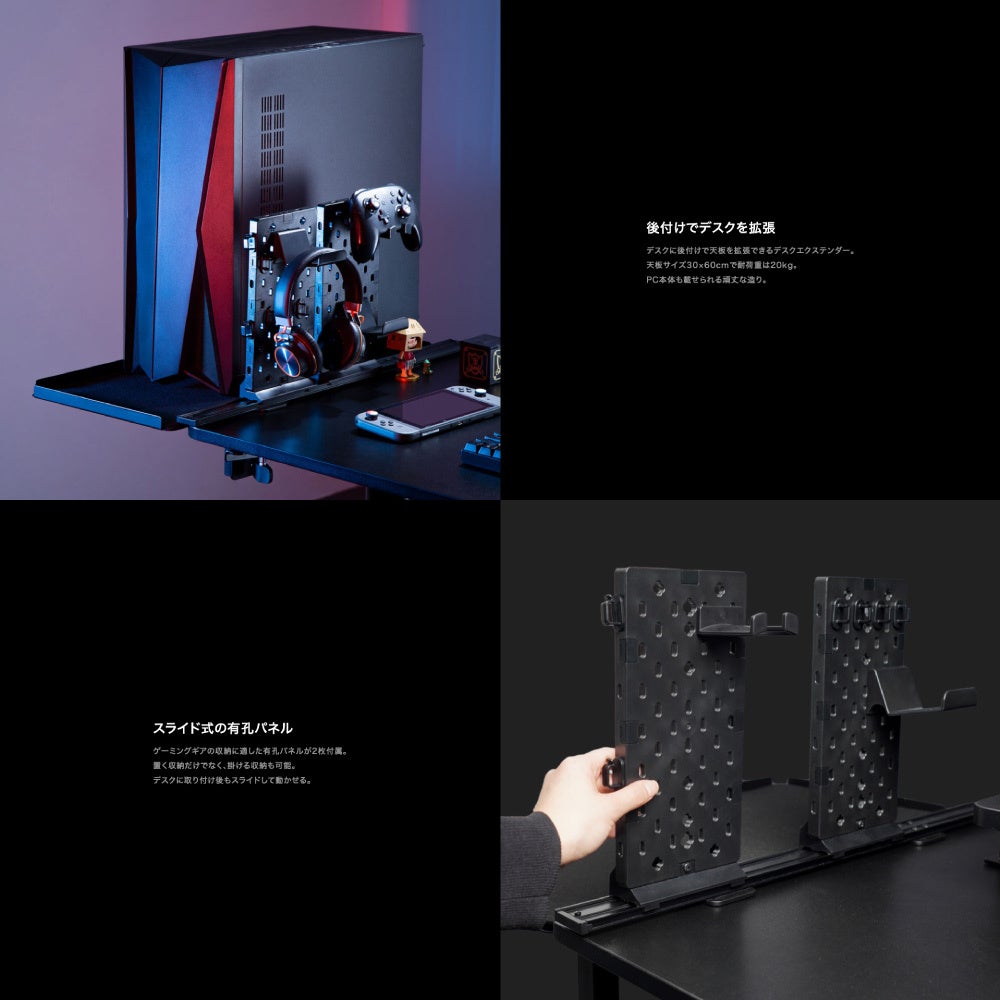 デスクを拡張&スライド式の有孔パネルでゲーミングギアの収納ができる