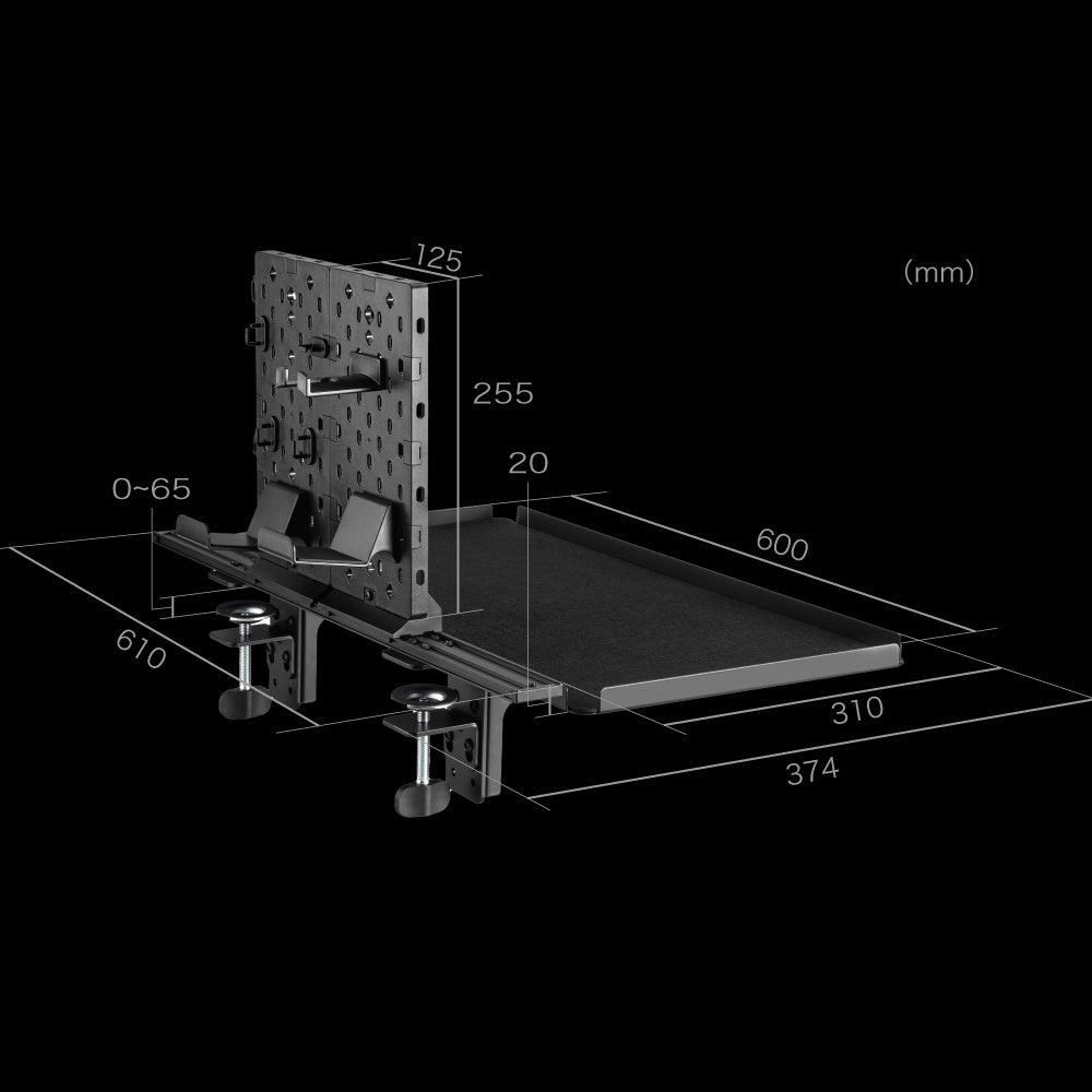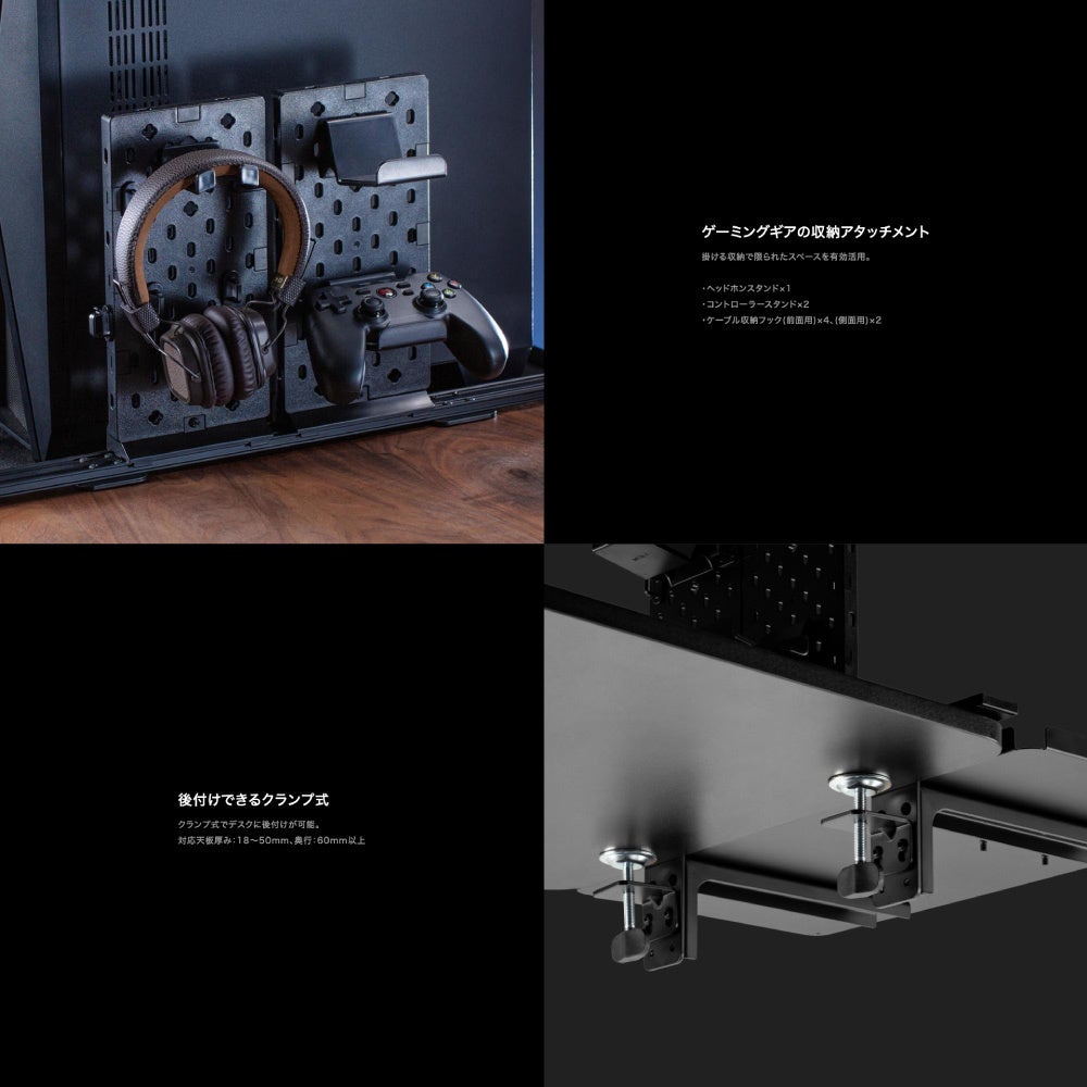 クランプ式で机に固定(対応天板厚み:18~50mm、奥行:60mm以上)。30×60cmの天板で机のスペースを広げることができます。耐荷重20kgでパソコンなども安心して置けます。2枚の有孔パネルと付属のアタッチメントで様々なモノをかけて収納することができます。有孔パネルはスライド可能。