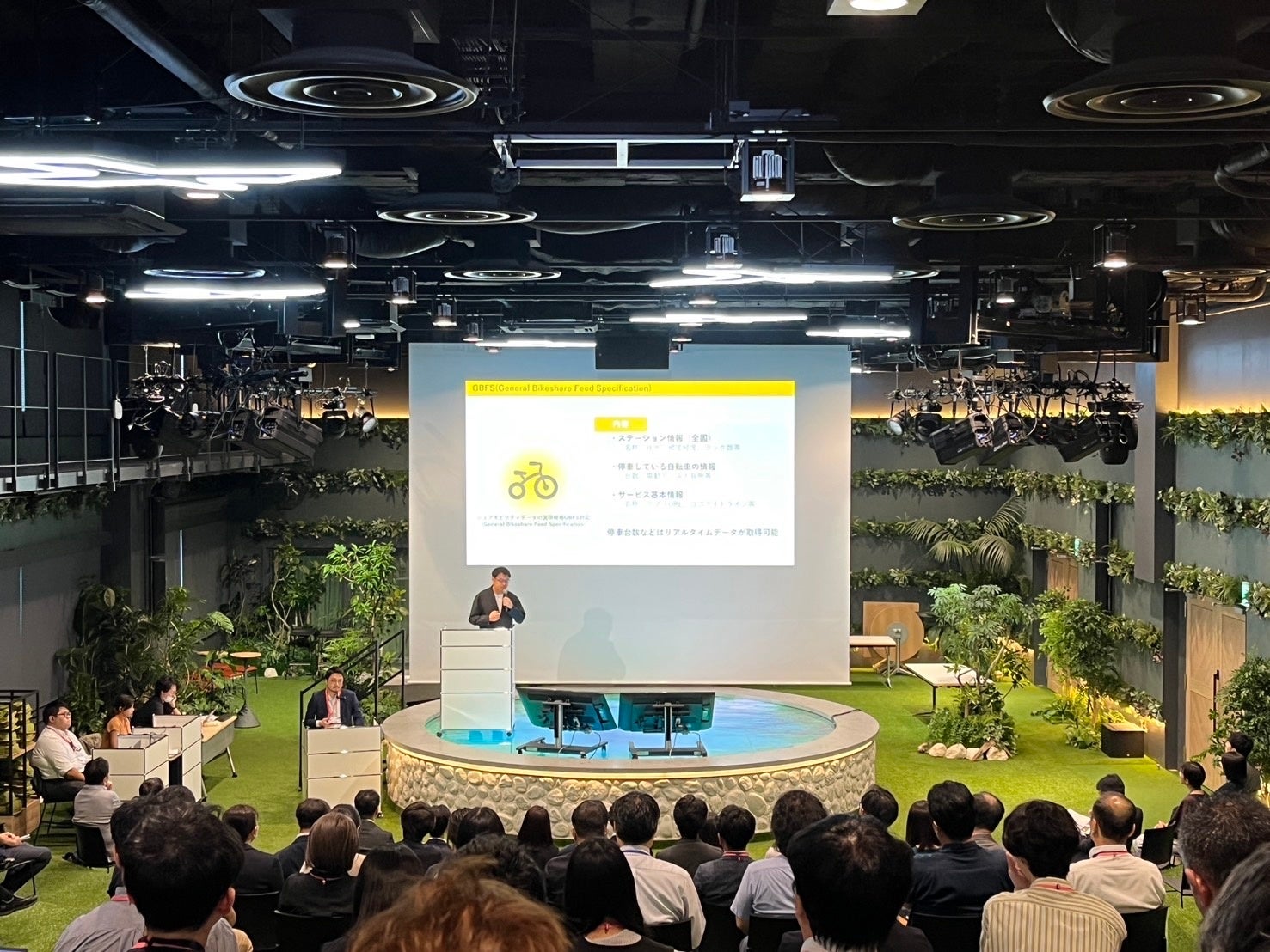 第一部では、まず東京都都市整備局都市基盤部、国土交通省総合政策局モビリティサービス推進課、公共交通オープンデータ協議会の担当者によるセッションが開催され、国や自治体、業界からみる課題や展望を説明されました。その後行われたピッチプレゼンでは計6名の方が登壇され、各社の事業やデータの利活用について説明を行う中で、当社は「マイクロモビリティのオープンデータ化と利活用」を題し、シェアサイクル業界のオープンデータ化やその事例、課題や今後の展望を紹介しました。