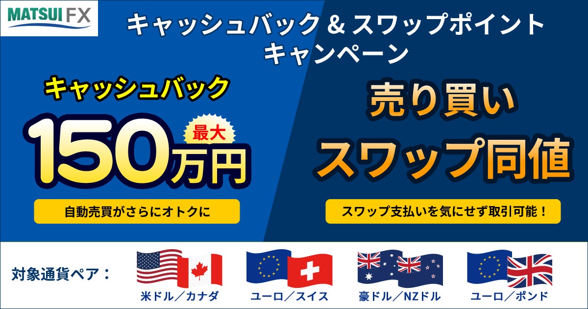 【松井証券 FX】自動売買取引応援!4通貨ペアを対象にキャッシュバック・スワップ同値キャンペーンを同時開催!