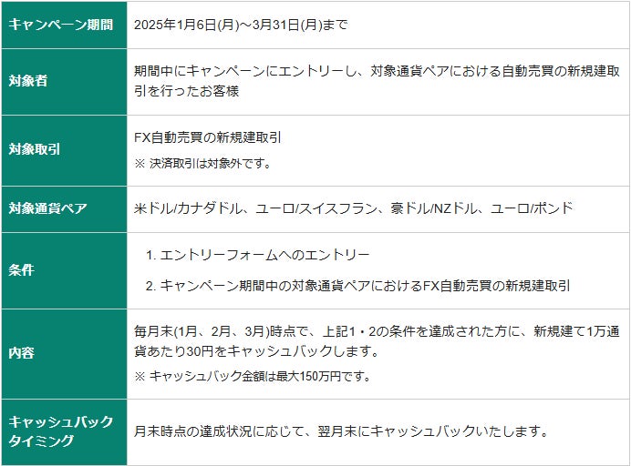 対象4通貨ペア(米ドル/カナダドル、ユーロ/スイスフラン、豪ドル/NZドル、ユーロ/ポンド)にて、自動売買の新規建取引を行ったお客様に、1万通貨あたり30円(最大150万円)をキャッシュバックいたします。キャンペーン参加には、エントリーが必要です。エントリーフォームは、12月30日(月)に公開予定です。