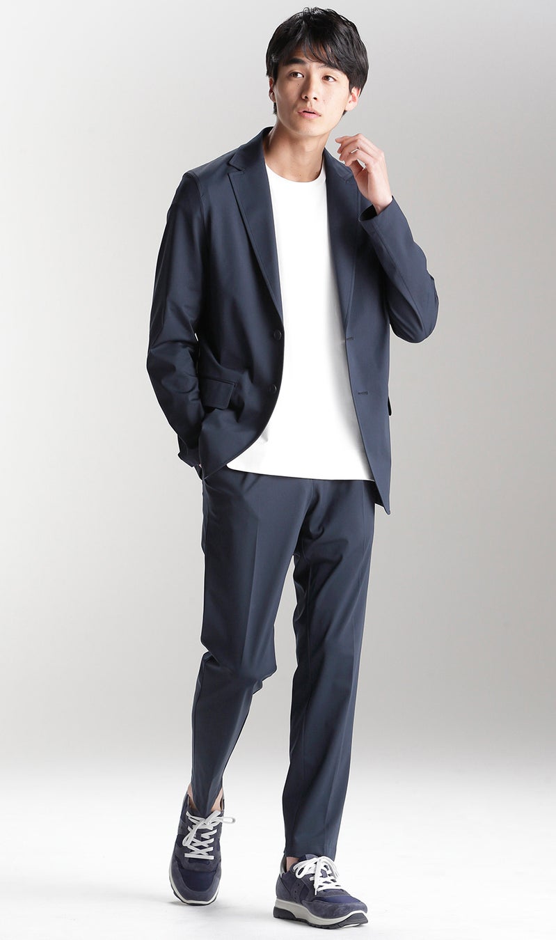 「ゼロプレッシャースーツ」は、最大の特徴でもある縦・横の高い伸縮性や防シワ性、自宅の洗濯機で丸洗いできるイージーケア性を備えた高機能スーツとなっています。今回の商品は、機能をそのままにジャケットのデザインを2型用意しました。テーラードジャケットは、ウエストを絞らずに少しゆったりめに設計し、Vカラージャケットは襟がないことで少しカジュアルな印象にしています。さらにパンツは、ウエストゴムとドローコードでゆったりと着用できる他、9分丈にすることで補正なしでも持ち帰りができるタイパ仕様です。
