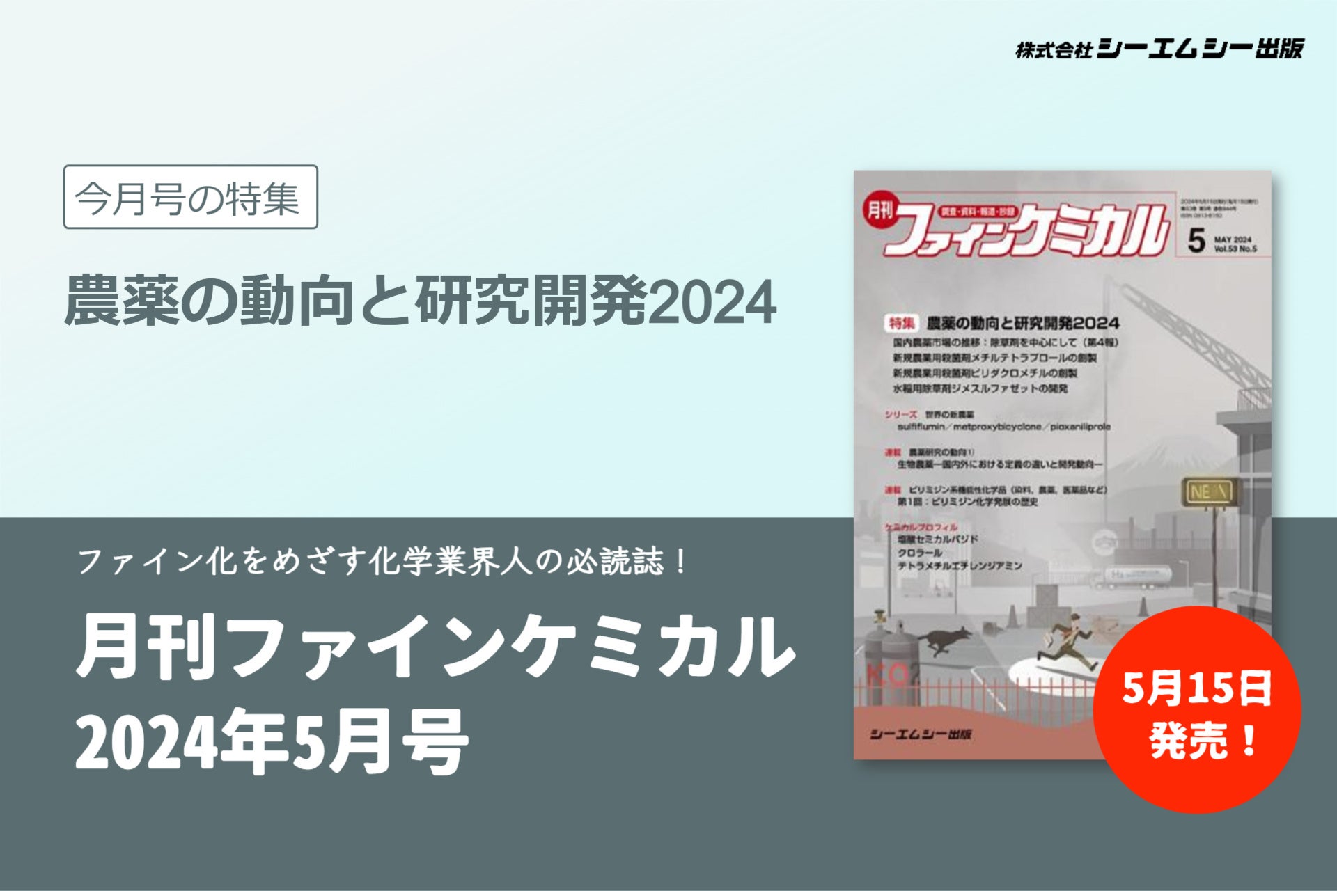 『月刊ファインケミカル 2024年5月号(特集:農薬の動向と研究開発2024)』 発行・発売:シーエムシー出版 発売日:2024年5月15日 価格(税込):7,700円 体裁:B5判、フルカラー ISSNコード:0913-6150 商品詳細ページURL: https://www.cmcbooks.co.jp/products/detail.php?product_id=9423 |