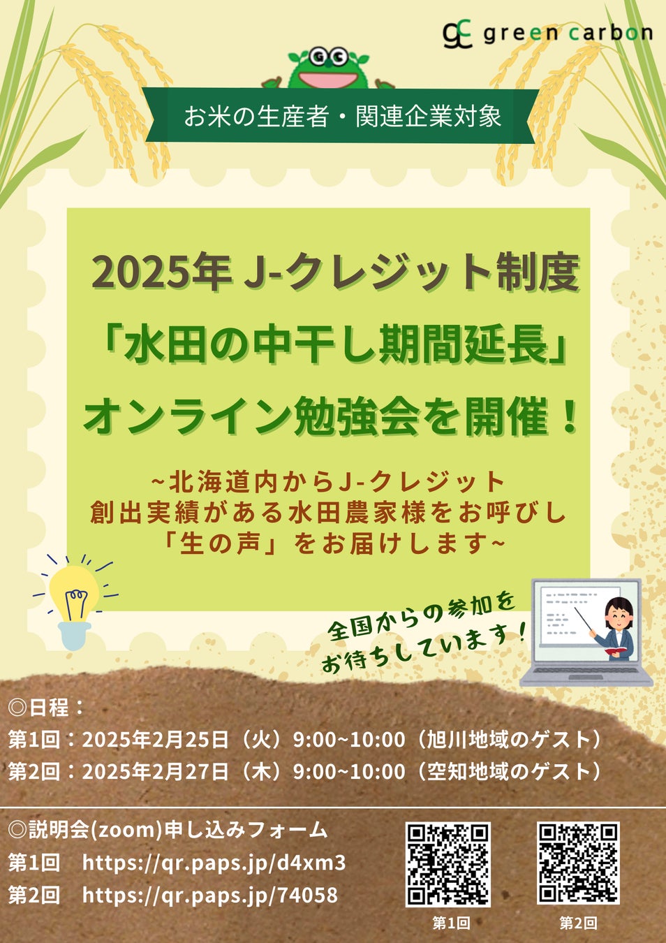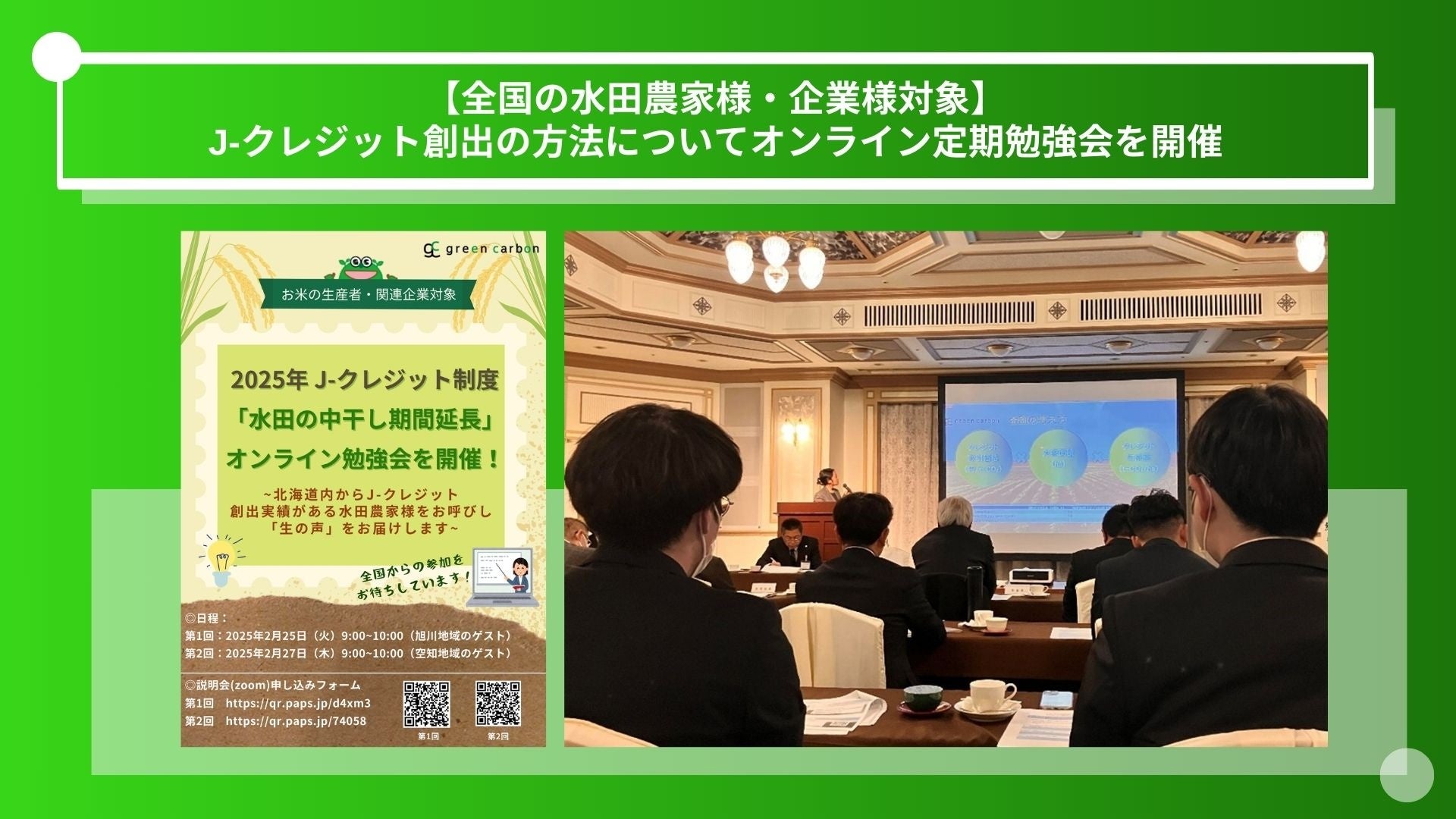 【全国の水田農家様・企業様対象】Green Carbon株式会社は、水田の中干し期間延長を活用した、メタンガス削減によるJ-クレジット創出の方法についてオンライン勉強会を開催