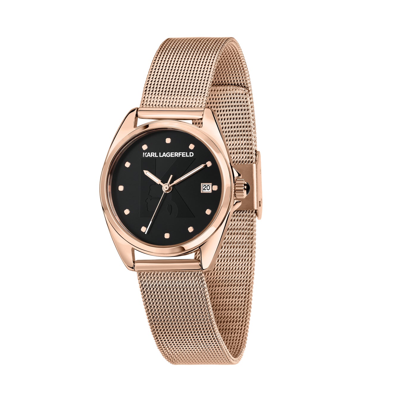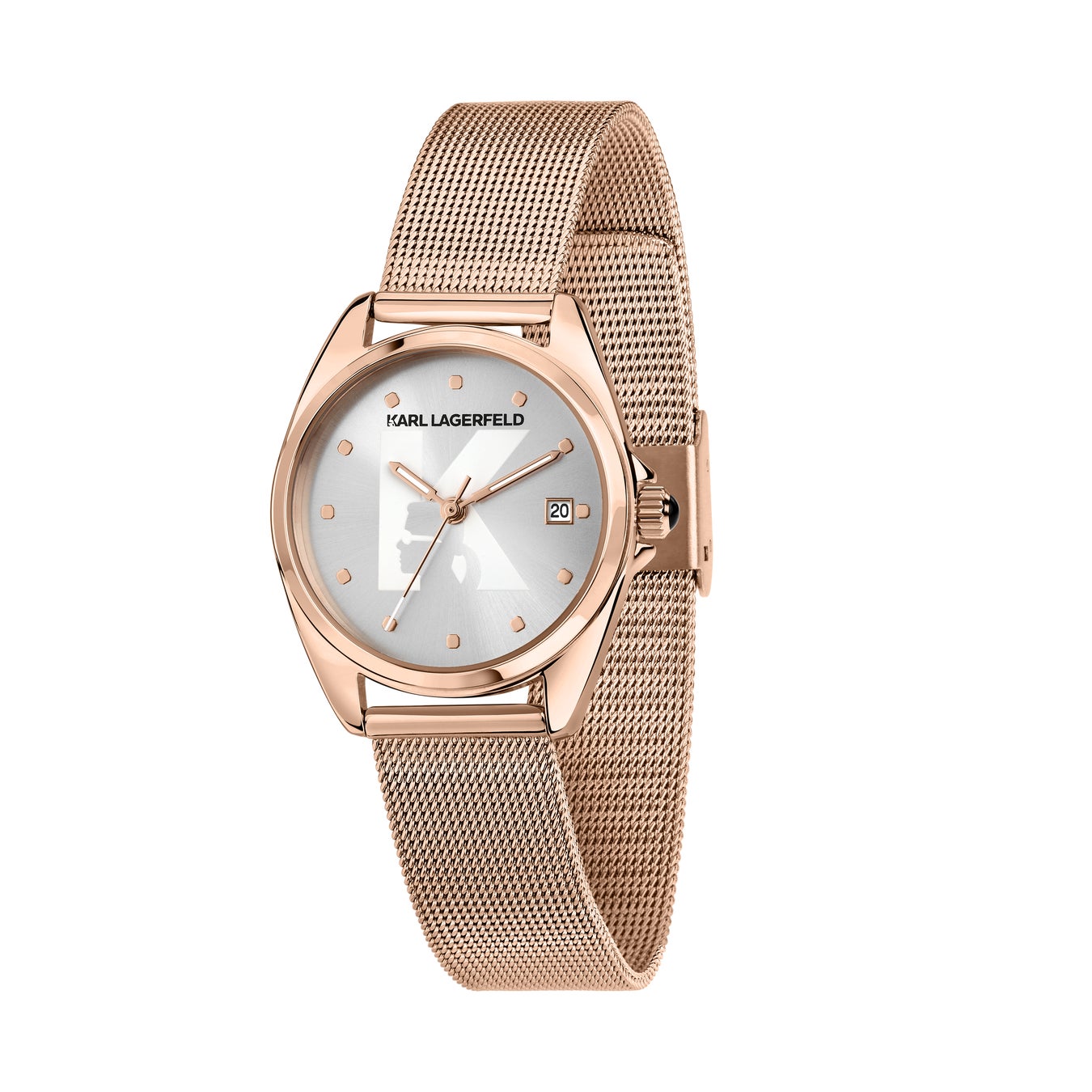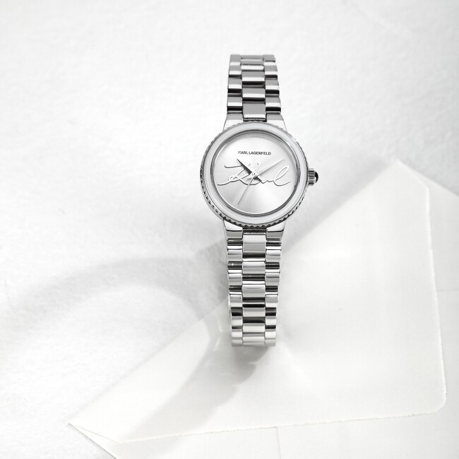 コレクションとして初めて「Karl」の手書き風ロゴを文字盤にあしらった、特別感あふれるデザイン。柔らかな光沢を放つマザーオブパール調のダイアルにエレガントなロゴが軽やかに走り、まるでジュエリーのような華やかさとアーティスティックな魅力を同時に引き立てます。さらに、ブランドとして初採用となるメッシュベルトが、上品かつモダンな表情をプラスし、より洗練された印象に仕上がっています。
