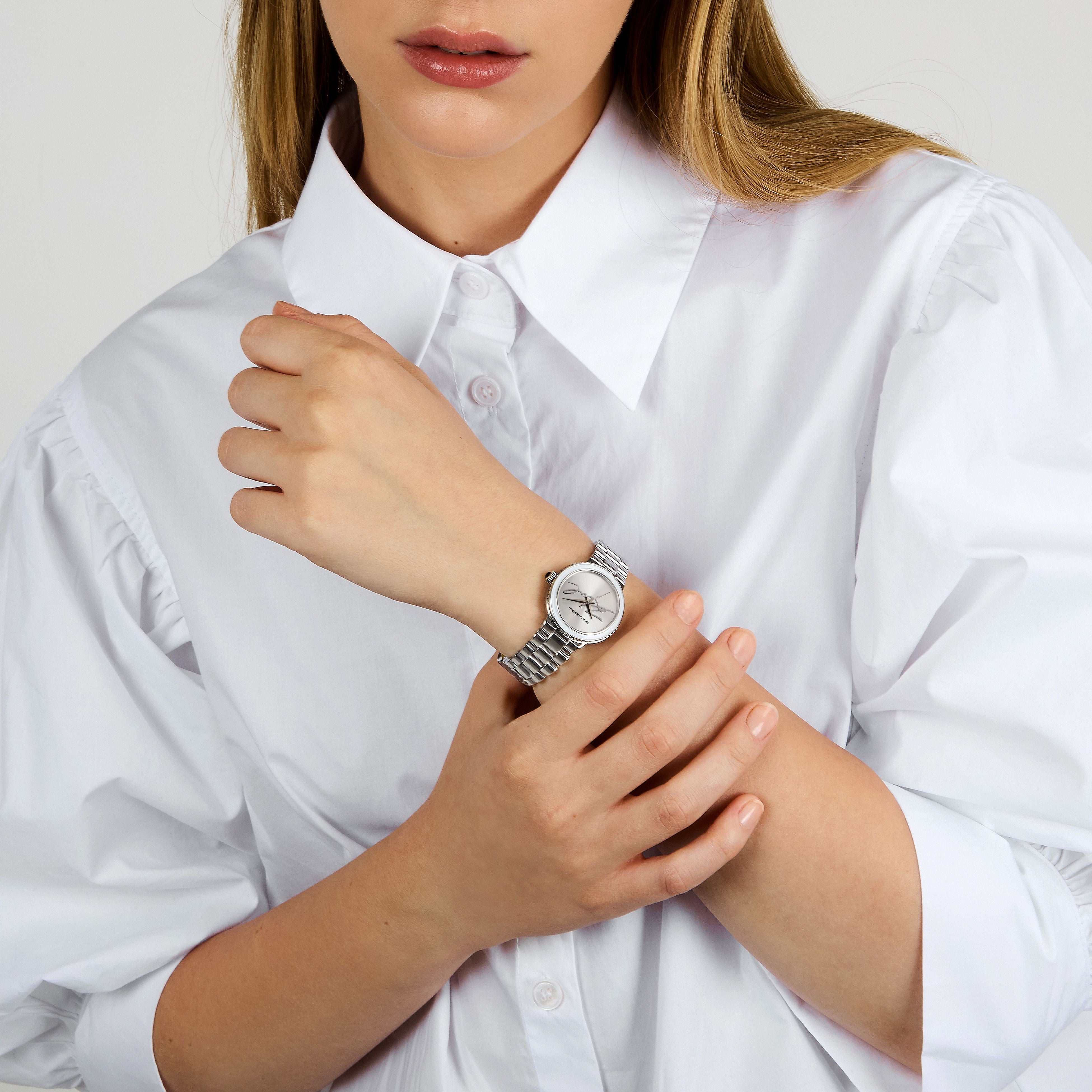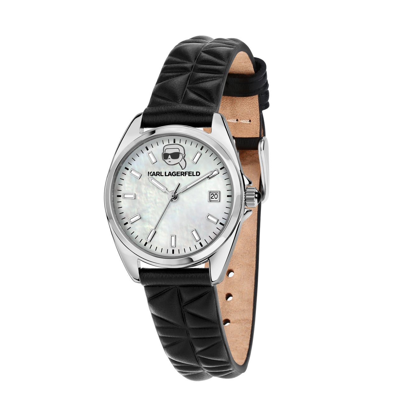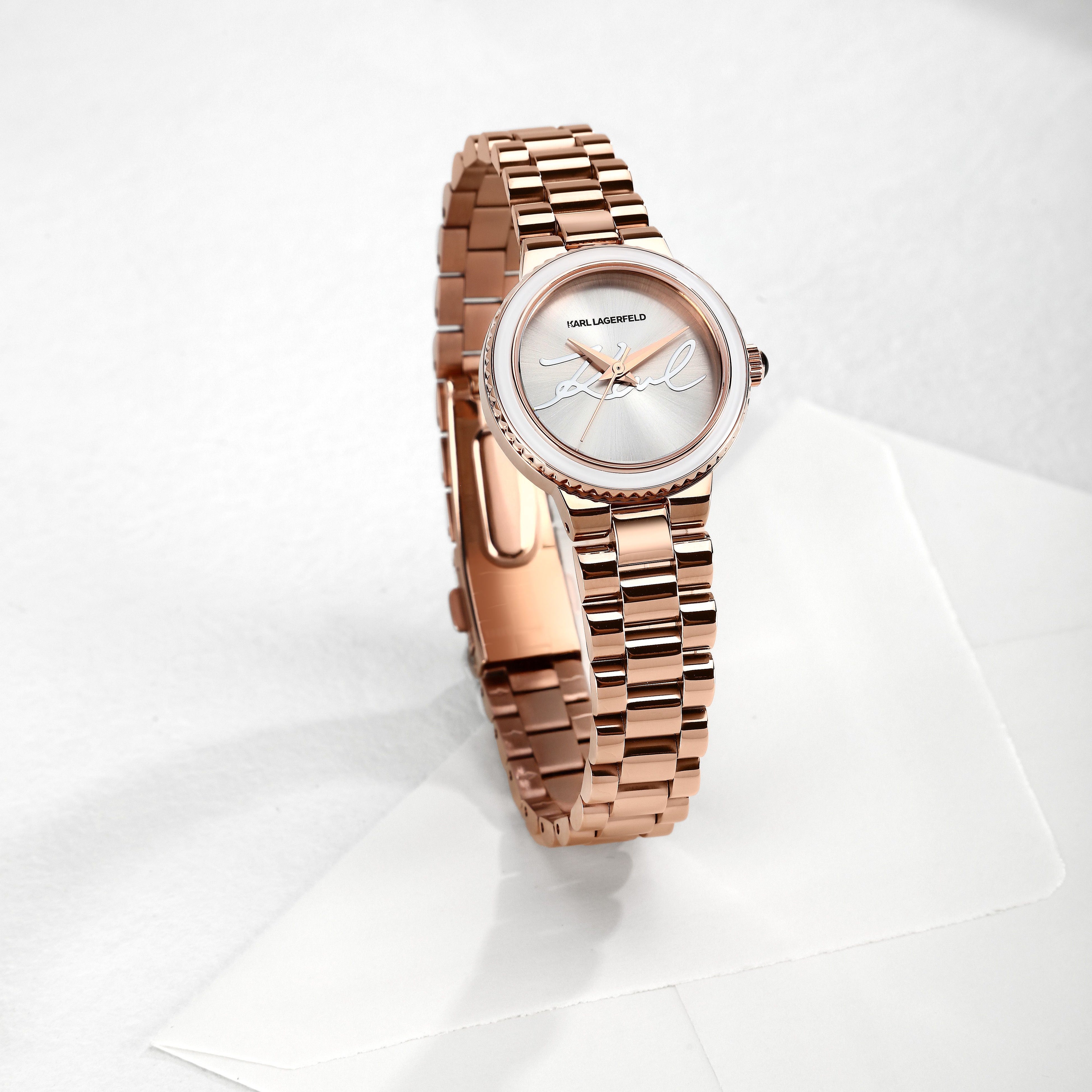 コレクションとして初めて「Karl」の手書き風ロゴを文字盤にあしらった、特別感あふれるデザイン。柔らかな光沢を放つマザーオブパール調のダイアルにエレガントなロゴが軽やかに走り、まるでジュエリーのような華やかさとアーティスティックな魅力を同時に引き立てます。さらに、ブランドとして初採用となるメッシュベルトが、上品かつモダンな表情をプラスし、より洗練された印象に仕上がっています。