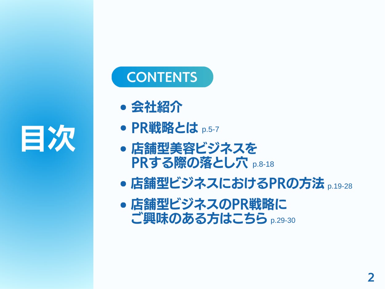 本レポートは、美容ビジネスにおいて店舗が効率よくPRを行い、集客に繋げる方法について詳しく解説しています。本レポートでは、店舗型美容ビジネスのPRやマーケティングのコツについて紹介し、安定した店舗型美容ビジネス運営を実現するために最適なPR方法について、参考となる情報を提供しています。