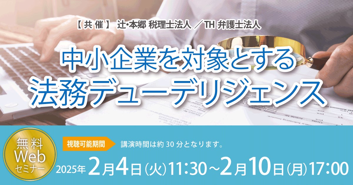 辻・本郷 税理士法人(本社:東京都新宿区、理事長:桑木小恵子)は、TH弁護士法人(本社:東京都新宿区、代表社員:新井健一郎)の2社共催で「中小企業を対象とする法務デューデリジェンス」セミナーを開催いたします。法務デューデリジェンス(法務DD)は、M&Aにおいて対象会社が買収にふさわしい企業かどうかを法務的な観点で検証し、最終的な意思決定に役立てるためのプロセスです。法務DDの一般論から、中小企業の法務DDにおいて検出されるよくある検出事項について、弁護士がポイントをくわしく解説します。