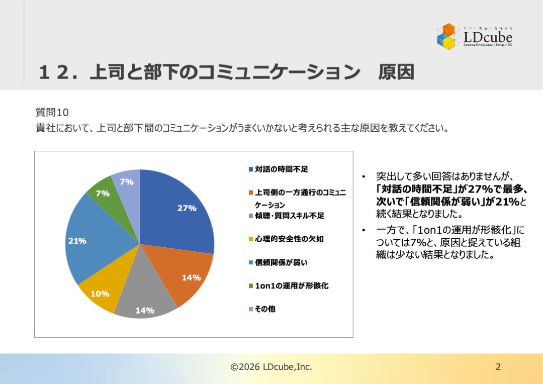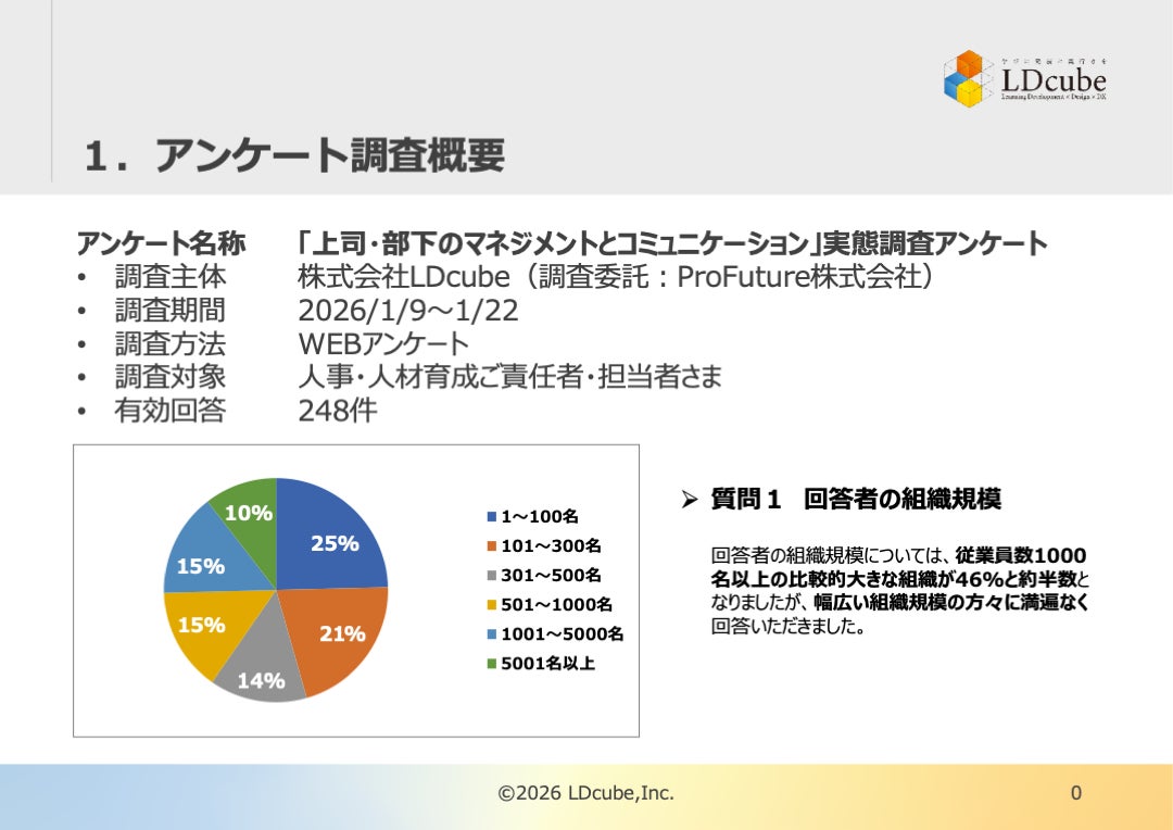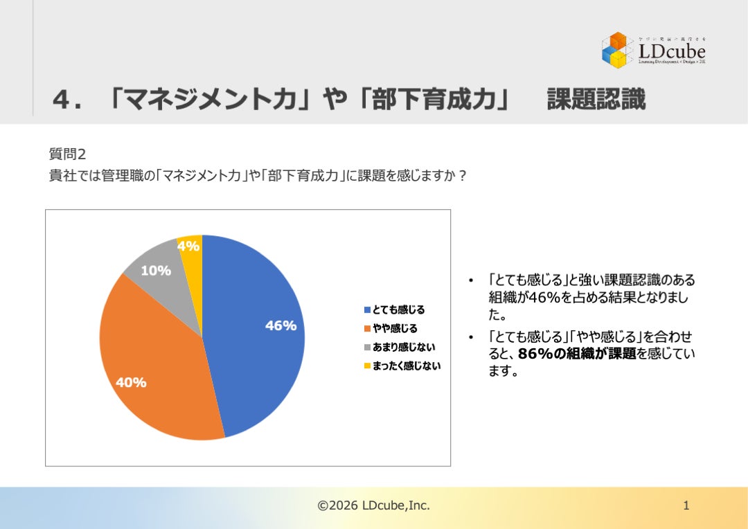 研修のスタイルにとらわれない企業向け人材育成サービスを提供する株式会社LDcube(本社:東京都千代田区、代表取締役社長:新井澄人、以下「当社」)は、「【2026年調査レポート速報!】管理職のマネジメントに関する実態調査結果を解説!『86%の組織が抱える課題』を紐解くヒントを紹介!」と題してウェビナーを開催しますので、お知らせします。