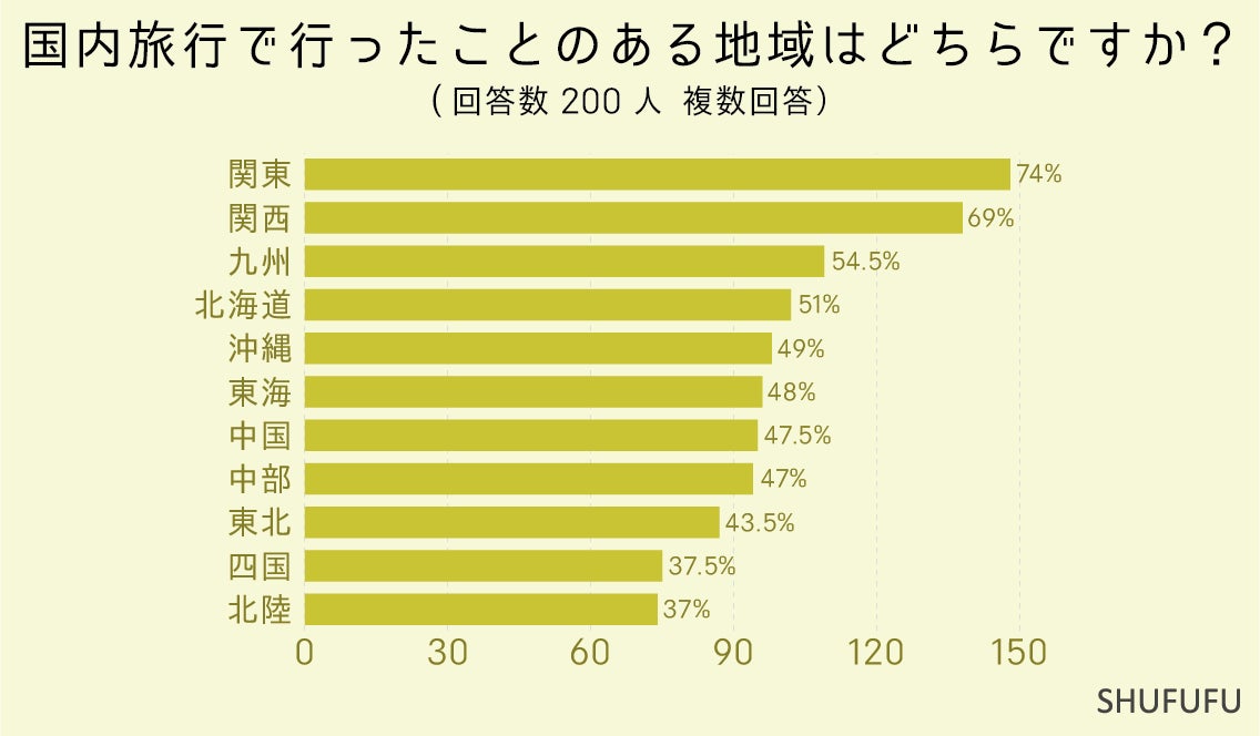 国内旅行で行ったことのある地域に関しては1位「関東(74%)」、2位「関西(69%)」でした。関東・関西のなかでも沢山の観光スポットがあり、メジャーな観光地なので多くなっていました。