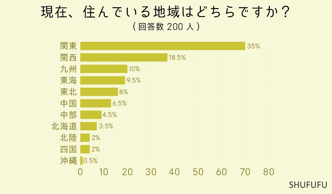 今回のアンケート参加者に「現在、住んでいる地域は?」の問いに対して最も多かったのが「関東(35%)」でした。 次いで「関西(18.5%)」「九州(10%)」という結果でした。