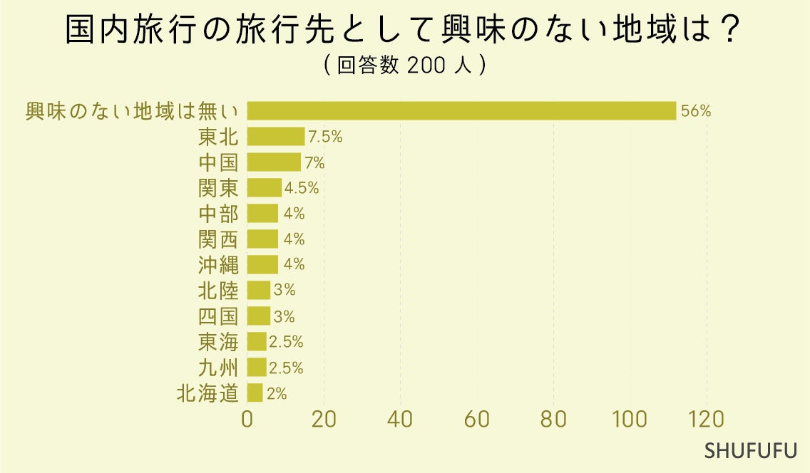 国内旅行の旅行先として興味のない地域を尋ねたところ、1位は「興味のない地域は無い(56%)」、2位「東北(7.5%)」となりました。「興味がない地域は無い」方が最多になりましたが、多くの方が日本各地それぞれに行きたい場所があるようですね。東北や中国地方にも魅力的なスポットはあるとは思いますが、知名度が低いのかもしれません。